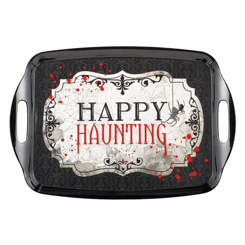 If you want to throw a killer monster mash youβre going to want to serve your treats on our Happy Haunting Tray. This large black tray features a Happy Haunting message, blood splatter and raised edges so even the biggest scare wonβt send your treats tumbling. The attached handles make for easy carrying.