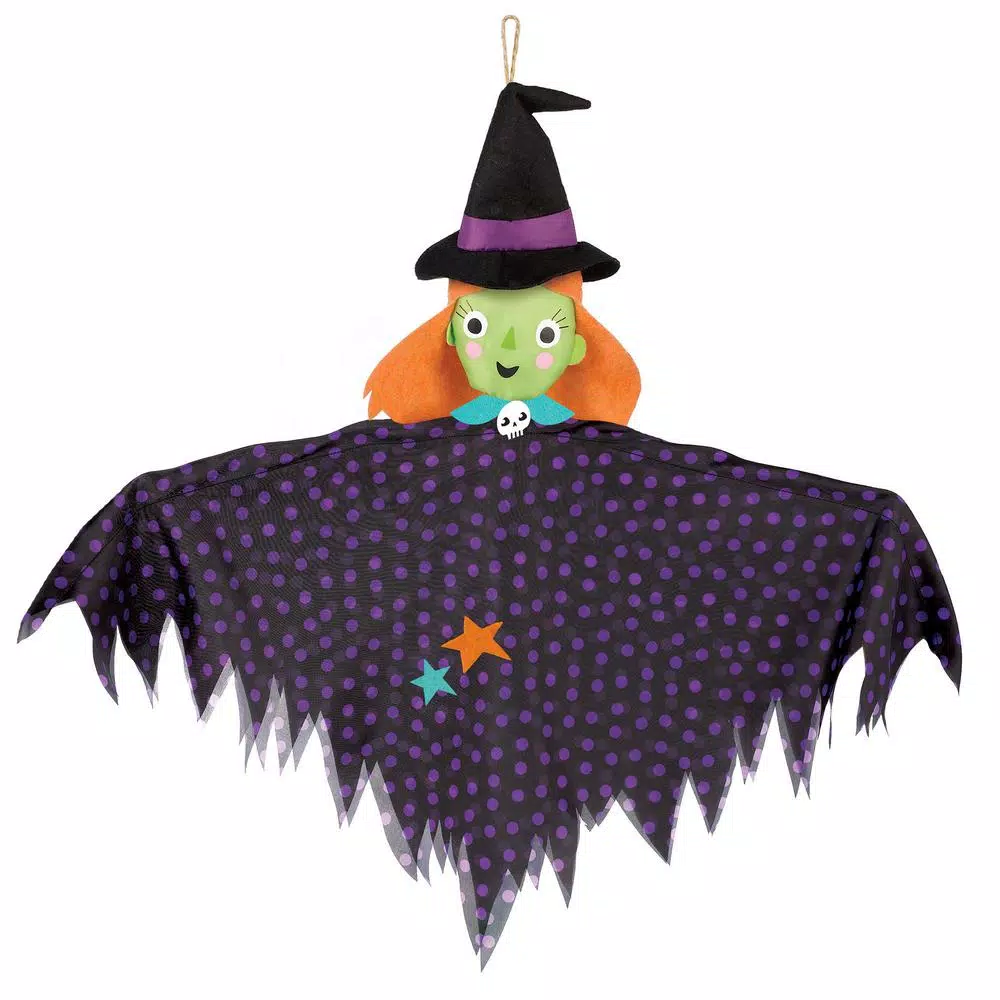 Double, double, toil and trouble, our cute Medium Hanging Witch Decoration wonβt cause you any trouble this Halloween season. This cute witch features a black drape with purple polka dots, a matching witchβs hat and a charming face. Use the included loop to hang this decoration anywhere, indoors or out.