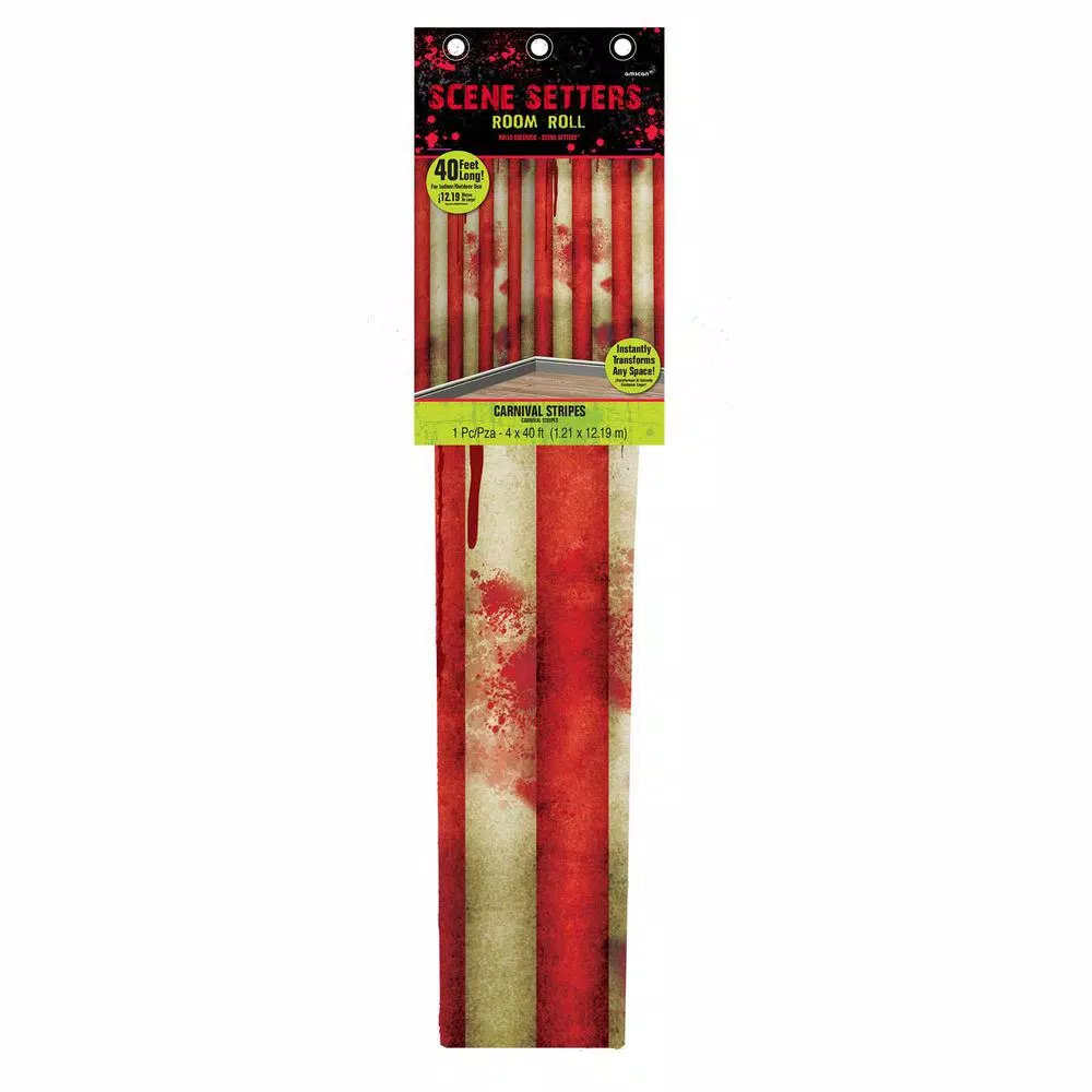 Even your walls deserve to dress up for Halloween and now they can with this Creepy Carnival Striped Scene Setter Room Roll. This plastic decoration features 40 ft. of blood splattered red and white stripes. The roll can transform your space and easily attaches with tape or sticky tack (not included).
