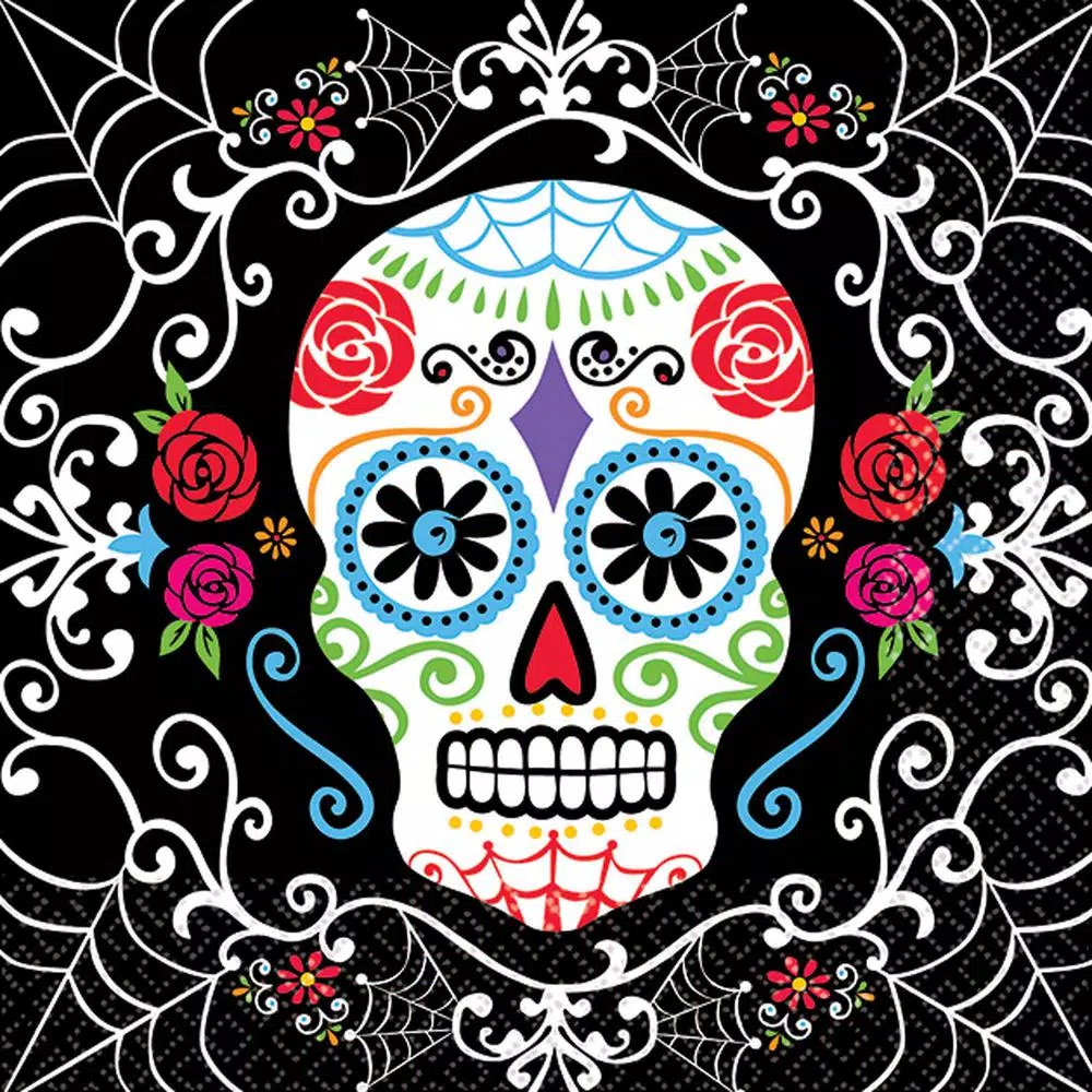 Amscanβs Day of the Dead 5 in. x 5 in. beverage napkins are a fun new design to introduce to your Halloween festivities or can be used more traditionally for celebrating lost loved ones. They feature a classic sugar skull against a black background. Scroll like webbing and colorful flowers cover the entire napkin. Each pack contains 36 2-ply beverage napkins.