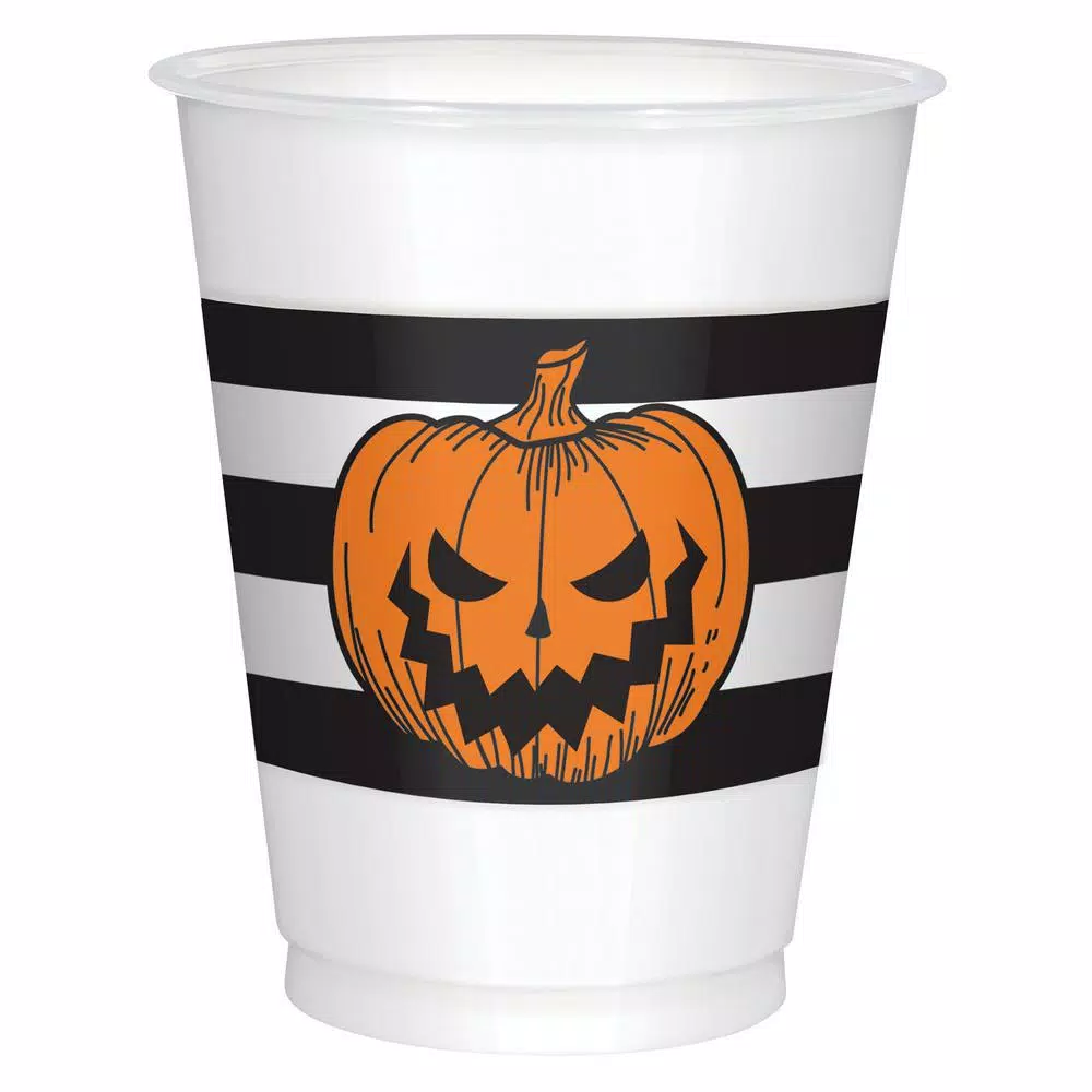 Itβs the great pumpkin, no itβs our Hallowsβ Eve Cups. Each plastic cup features black and white stripes as well as a sinisterly smiling jack-o-lantern. Fill these cups with your favorite cold beverage.