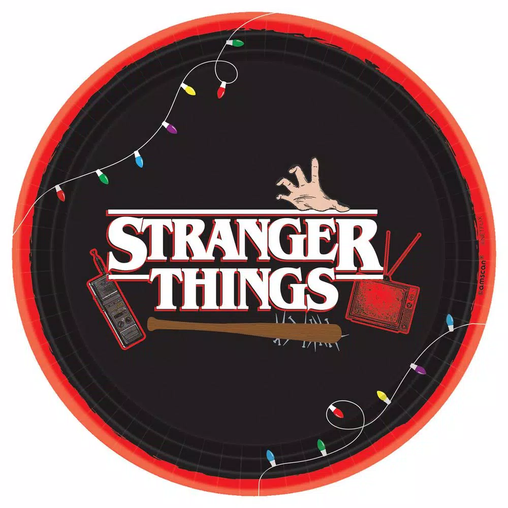 Things are about to get strange in here with our Stranger Things Plates. Each paper plate features the show logo, string lights, walkie-talkie, old tv and baseball bat full of nails. These are perfect for themed parties, viewing parties, or even Halloween.