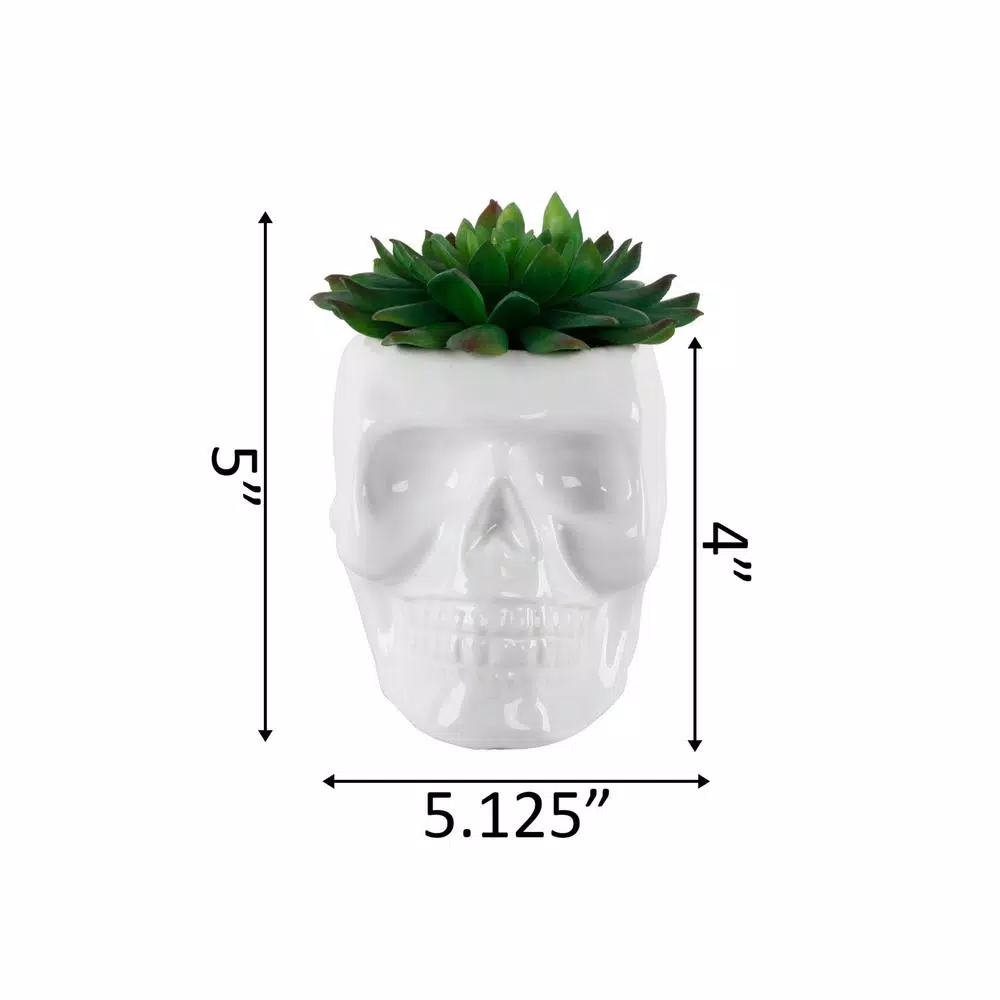 Bad to the Bone. Place these Skull Succulent Planters anywhere in your home to create an indoor Oasis. Hand-crafted by Artisans, our Skull planter will help upgrade your plant game in style. Made of Ceramic and painted White with glossy finish, this 4.5 in. x 3.5 in. x 4 in. tabletop planter will add a bit of chic nature to your living space. Faux succulent is included, so you never have to worry about watering real plants again. Beauty without the pain of caring for real plants. We always strive to make your life easier so you that you can have more time for the important things in life. Buy a few at a time, so you can start your own little Indoor Garden. (Hand-crafted by Artisans, Material: Ceramic, Plastic succulent, Size: 4.5 in. x 3.5 in. x 4 in., Color: White, Green-plants). No drainage hole, for Indoor Use Only.
