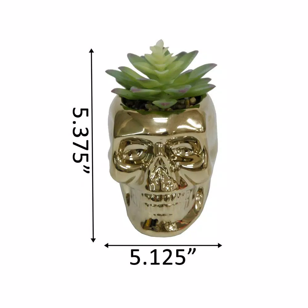 Bad to the Bone. Place these Skull Succulent Planters anywhere in your home to create an indoor Oasis. Hand-crafted by Artisans, our Skull planter will help upgrade your plant game in style. Made of Ceramic and painted Gold with metallic finish, this 5.125 in. x 4 in. x 5.375 in. tabletop planter will add a bit of chic nature to your living space. Faux succulent is included, so you never have to worry about watering real plants again. Beauty without the pain of caring for real plants. We always strive to make your life easier so you that you can have more time for the important things in life. Buy a few at a time, so you can start your own little Indoor Garden. (Hand-crafted by Artisans, Material: Ceramic, Plastic succulent, Size: 5.125 in. x 4 in. x 5.375 in., Color: Metallic Gold, Green-plants). No drainage hole, for Indoor Use Only.