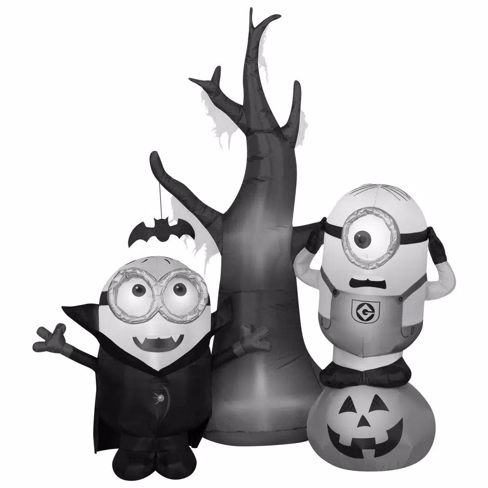 Greet your guests with these amazing Airblown inflatable characters. The Minions are ready for Halloween with a Jack-Oโ-Lantern and a spooky tree. Setup is super simple. Just plug it in, stake it down and watch the magic unfold. Display this cute Halloween decoration as a standalone or combine it with other Airblown Inflatables to create a custom scene. Includes everything needed for easy outdoor setup.