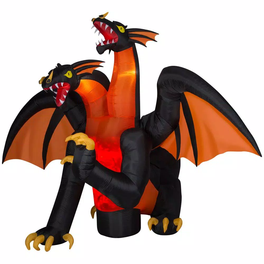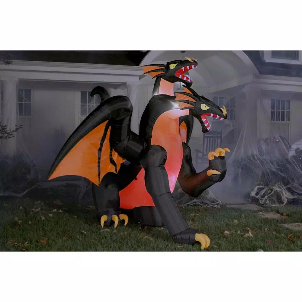 Double trouble awaits you this season with the Animated Inflatable 2-Headed Dragon. Featuring an incredible fire-and-ice and flaming mouth lighting effect, this 2-headed creature will frighten visitors and trick-or-treaters near and far. Standing over 7-1/2 ft. tall, the dragon inflates quickly and deflates easily for storage. To set up, simply plug it in, stake it down and watch the magic unfold.