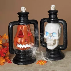 - Give a warm Halloween glow with this set of 3-assorted-theme, battery-operated, metal lanterns that include candles and a timer feature, they measure 6.69 in. Dia and 14.17 in. H