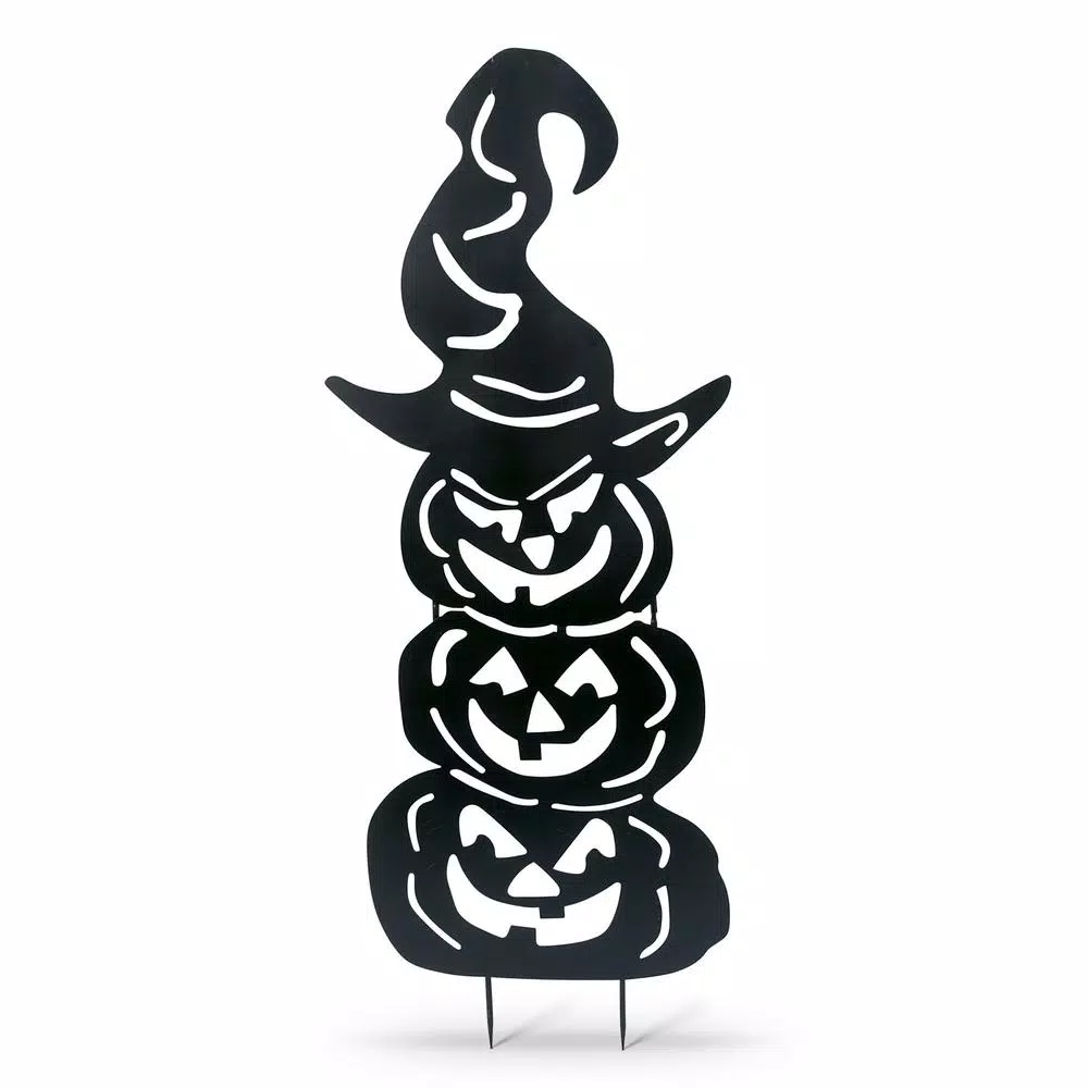 Give your neighbors a fright by creating your own personal haunted house with this spooky Jack-O-Lantern silhouette yard stake. This black metal trio figure will cast haunting shadows in your yard when placed behind a set of light stakes. This gives your home a spirited decor for the Halloween season. At 52.3 in. Tall, the silhouette is nearly the size of a grown person. The silhouetteβs base is affixed to a yard stick for easy installation into the ground. Whether you post these toothless pumpkins alone or with other Halloween yard art, you will definitely give your trick or treaters a pleasant scare.