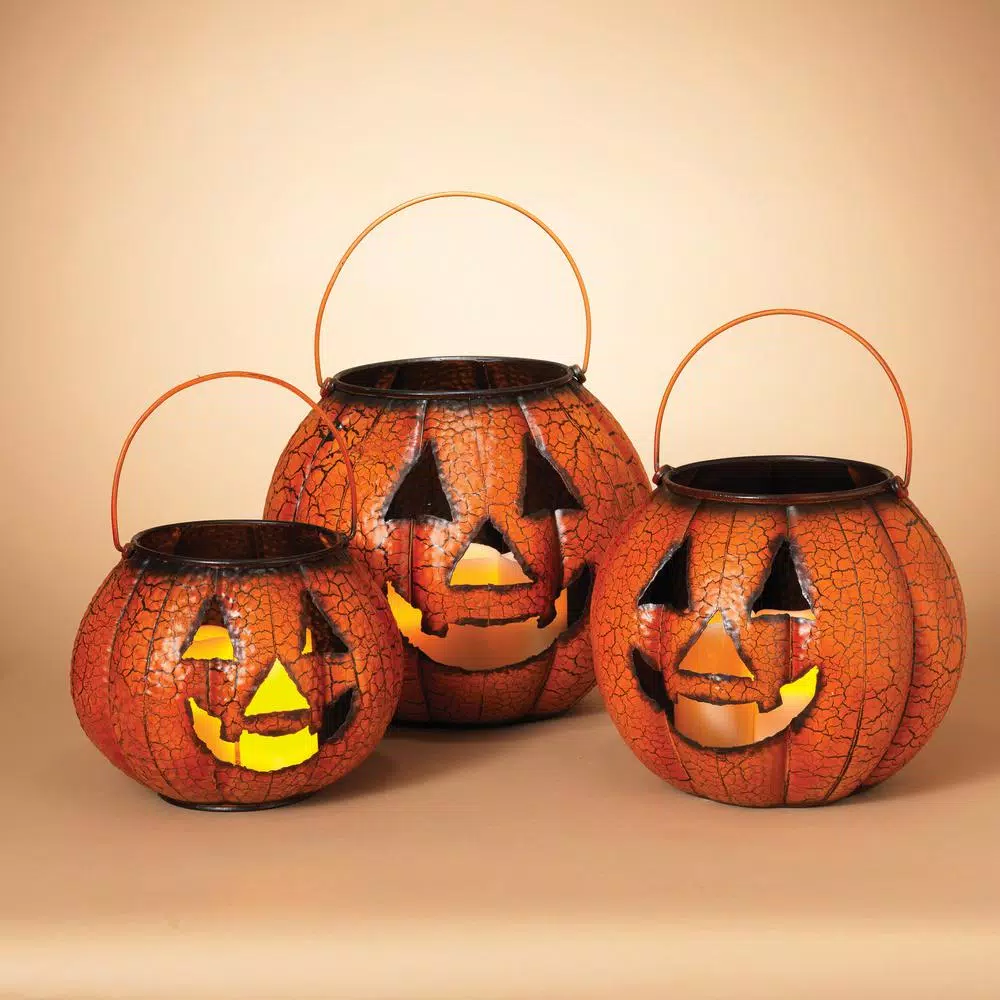 - Set of 3 nested, metal luminaries, each with a Jack-O-Lantern face cut-out, largest is 17.25 in. H, medium 14.5 in. and smallest 12.5 in.