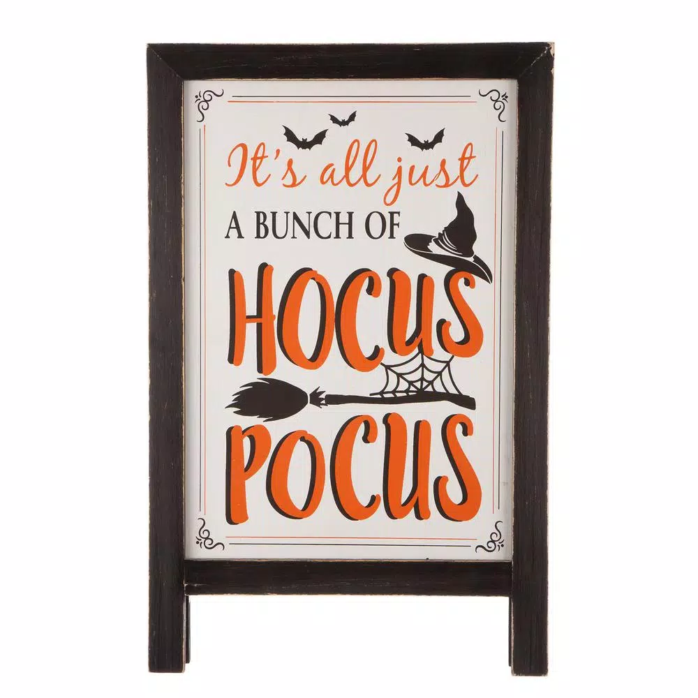 - Large wood Halloween easel is designed with hocus-pocus signs