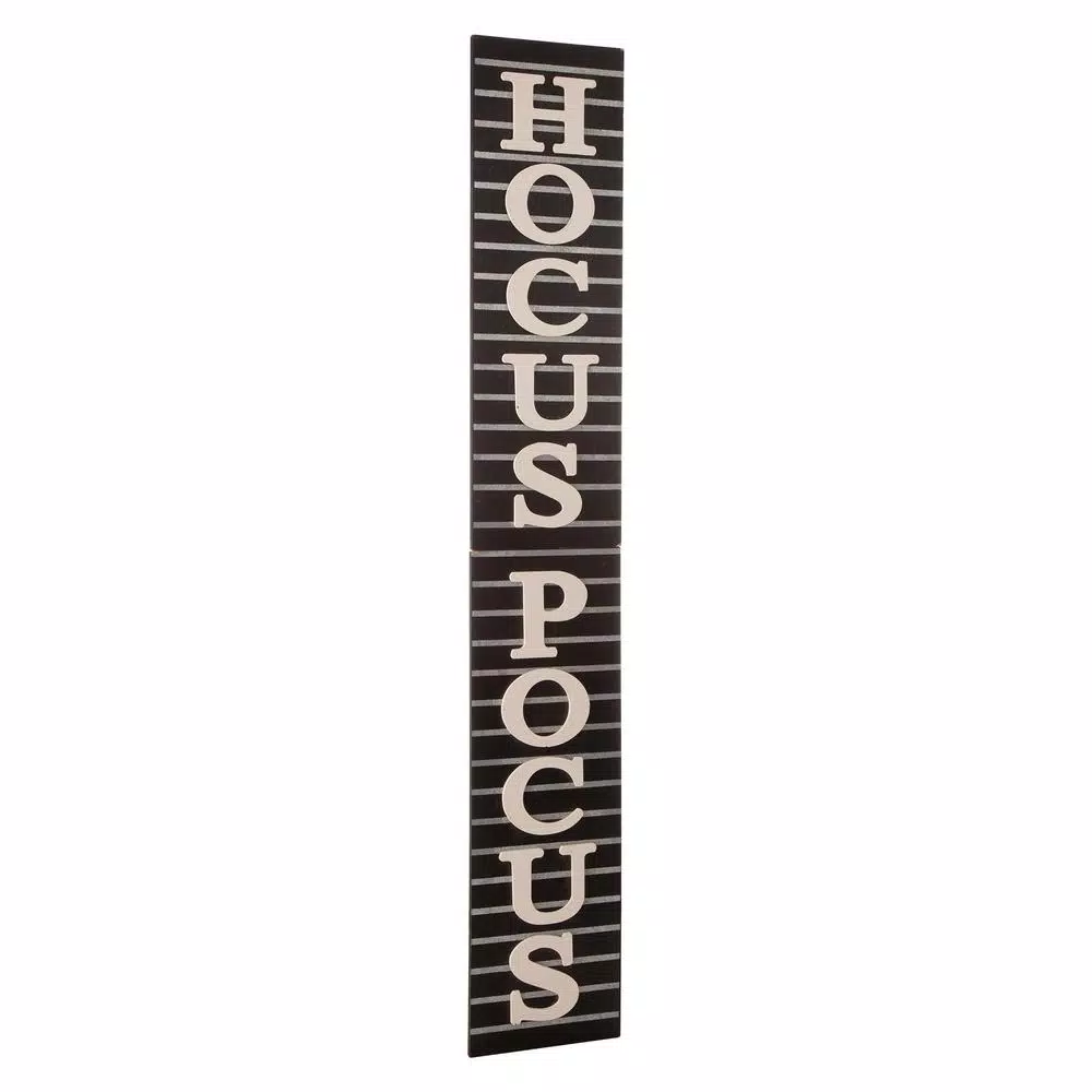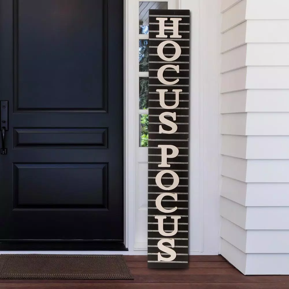 - Charming vertical porch sign, features the message HOCUS POCUS in white on a black wood background