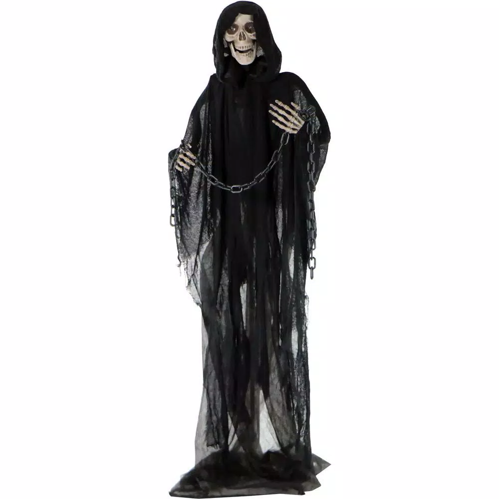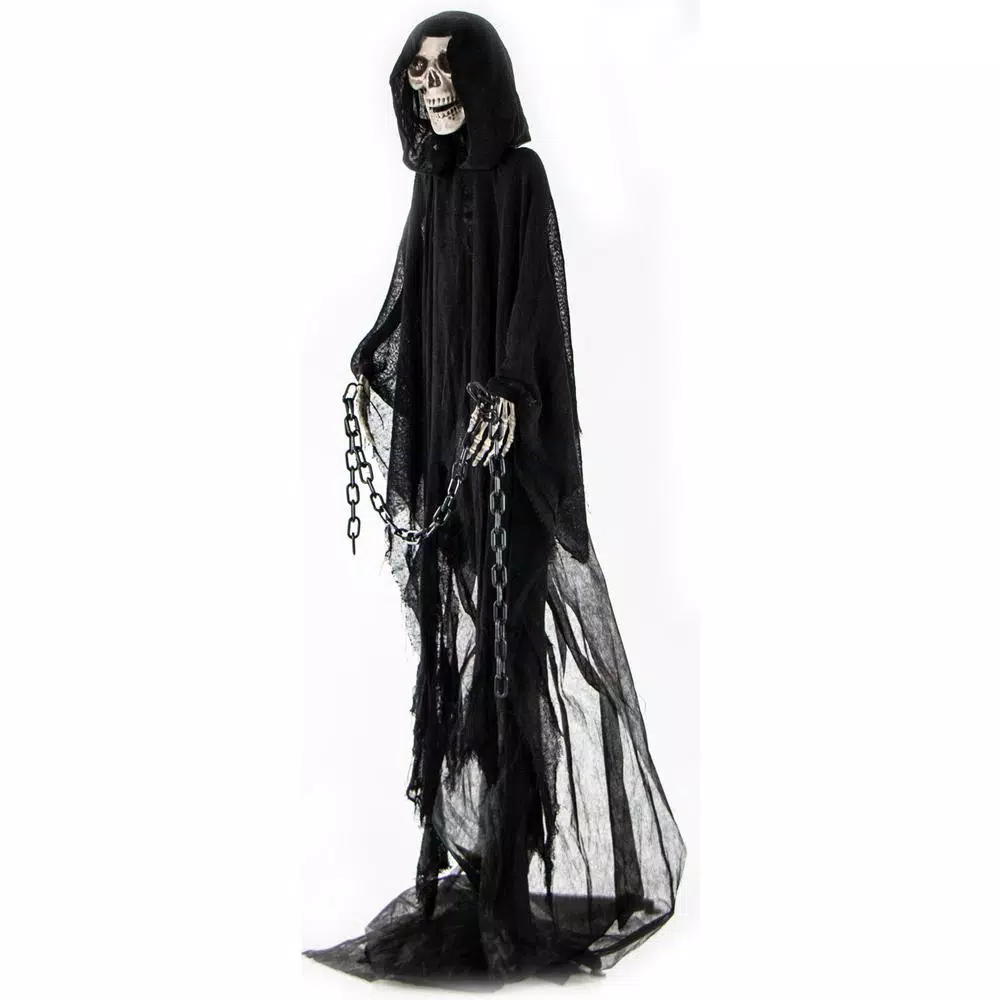 Enter, if you dare, into the horrifying world of Haunted Hill Farm. Our life-size, animated creepy creatures are just what you need to turn your home into the scariest haunted house on the block. Our wide choice of monsters, each more nerve-wracking than the last, is sure to create a hair-raising cast for the creepiest display you can imagine. Who is that lurking in the shadows of the night? Itโs our Moaning Grim Reaper and his chains of death searching for his next victim. Could it be you? With his rotating head and flashing white eyes, heโll startle your most stoic visitors. Creepy xylophone music plays amongst his haunting moans and groans to enhance the menacing effect. For thrills and chills so frightening your neighbors will run shrieking in horrendous delight, count on Halloween decorations from Haunted Hill Farm.