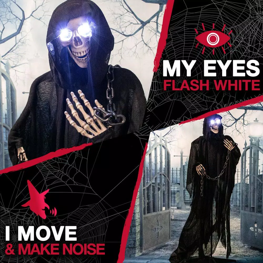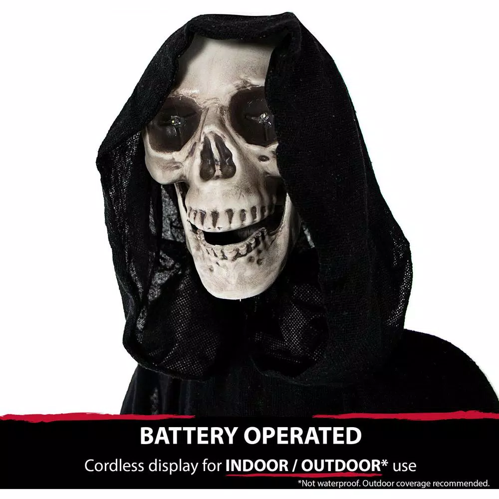 - MULTI-FUNCTIONAL: Creepy and spooky! This animated reaper lights up and moans. He will turn your home into a haunted house in no time. Prop on the stand or hang the angel of death for an spooky graveyard look.