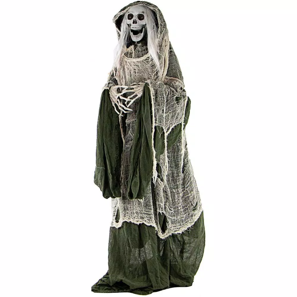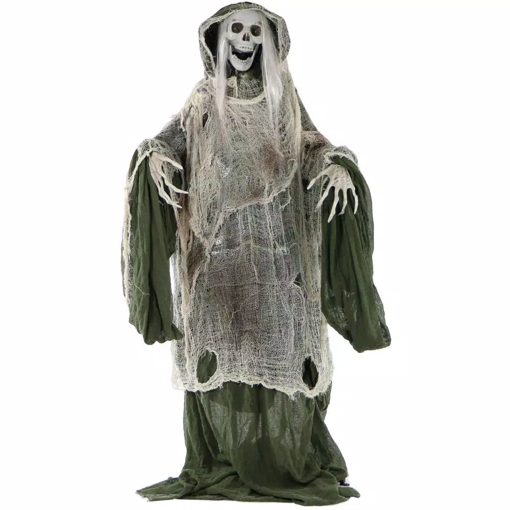 Enter, if you dare, into the horrifying world of Haunted Hill Farm. Our life-size, animated creepy creatures are just what you need to turn your home into the scariest haunted house on the block. Our wide choice of monsters, each more nerve-wracking than the last, is sure to create a hair-raising cast for the creepiest display you can imagine. Who is prowling in the dark looking for ghoulish mischief? Itโs our Moaning Skeleton frightfully dressed in a green hooded cloak and a raggy cobweb shroud. With his long straight hair, rotating head, and flashing white eyes, heโll startle your most stoic visitors. Creepy xylophone music plays amongst his haunting moans and groans to enhance the menacing effect. For thrills and chills so frightening your neighbors will run shrieking in horrendous delight, count on Halloween decorations from Haunted Hill Farm.
