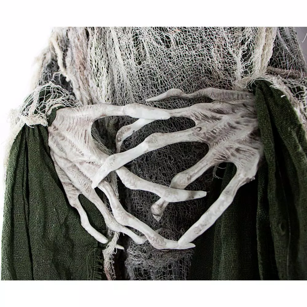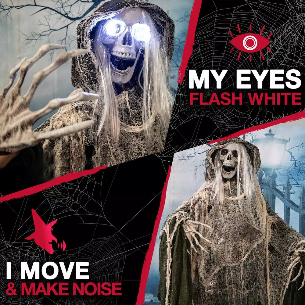 - MULTI-FUNCTIONAL: Creepy and spooky! This animated reaper lights up and moans. He will turn your home into a haunted house in no time. Prop on the stand or hang for a spooky graveyard look.