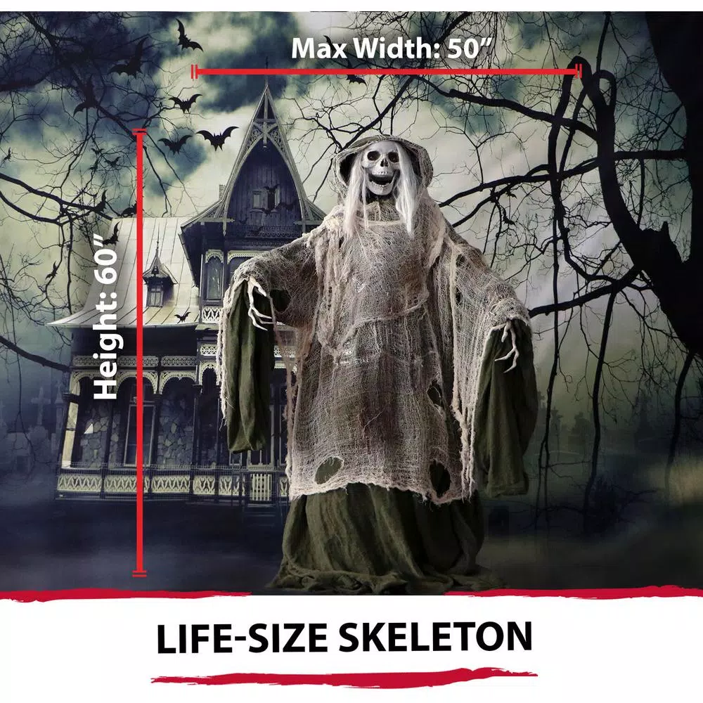- LIFE-SIZE ANIMATRONIC: Poseable Halloween skeleton is perfect for your indoor or (covered) outdoor decor. Display your animated decoration in a variety of different scary and evil ways at your next party.