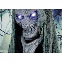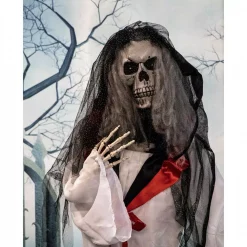 - MULTI-FUNCTIONAL: Creepy and spooky! This talking animated reaper lights up and moans. He will turn your home into a haunted house in no time. Prop on the stand or hang the angel of death for an spooky graveyard look.