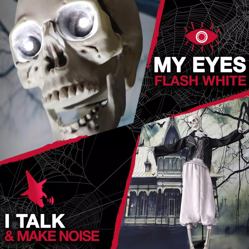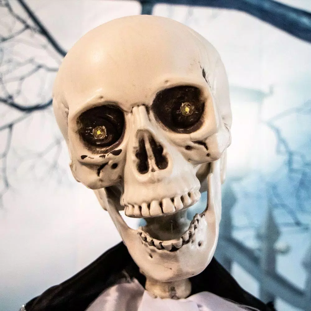 - LIFE-SIZE ANIMATRONIC: Poseable Halloween skeleton is perfect for your indoor or (covered) outdoor decor. Display your animated decoration in a variety of different scary and evil ways at your next party.