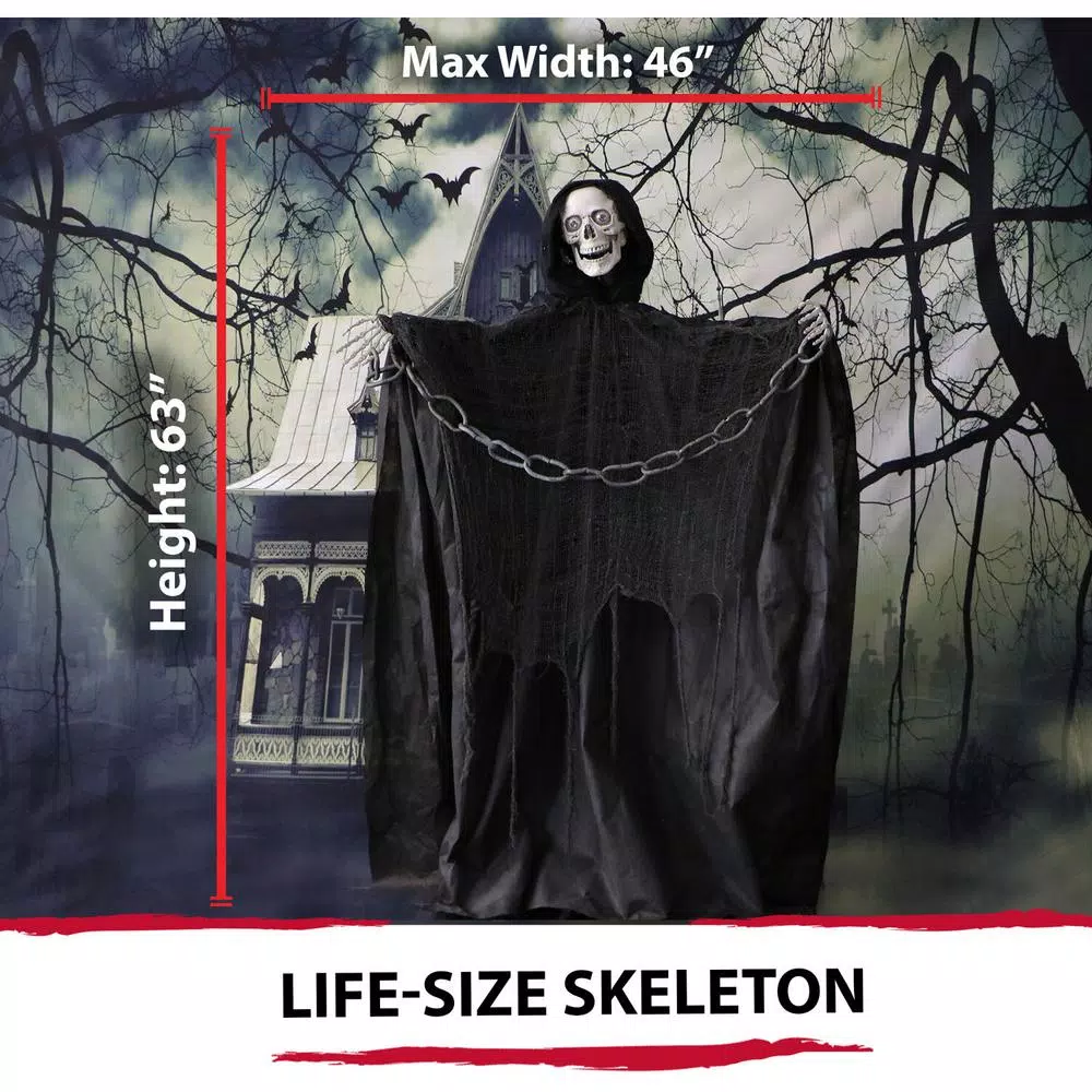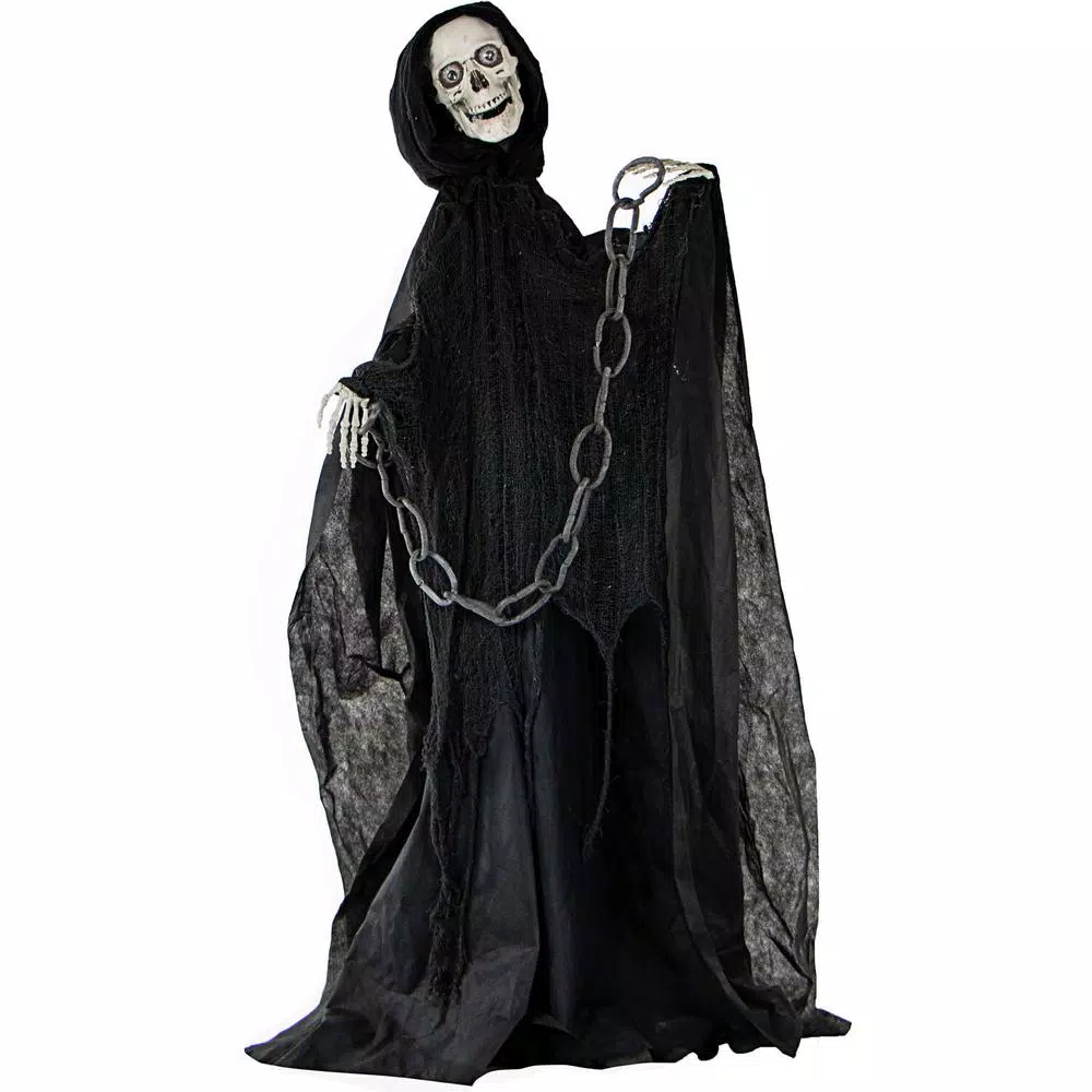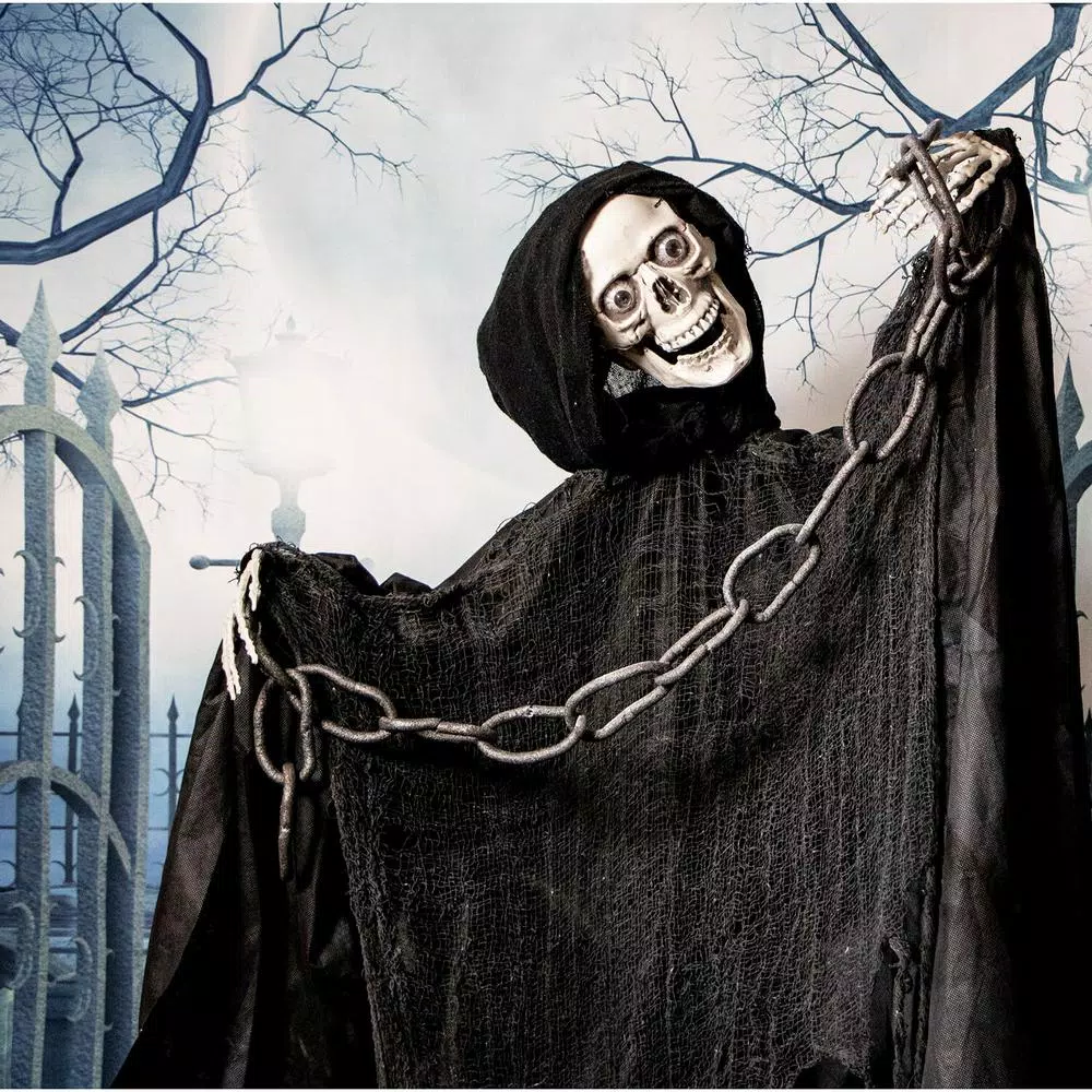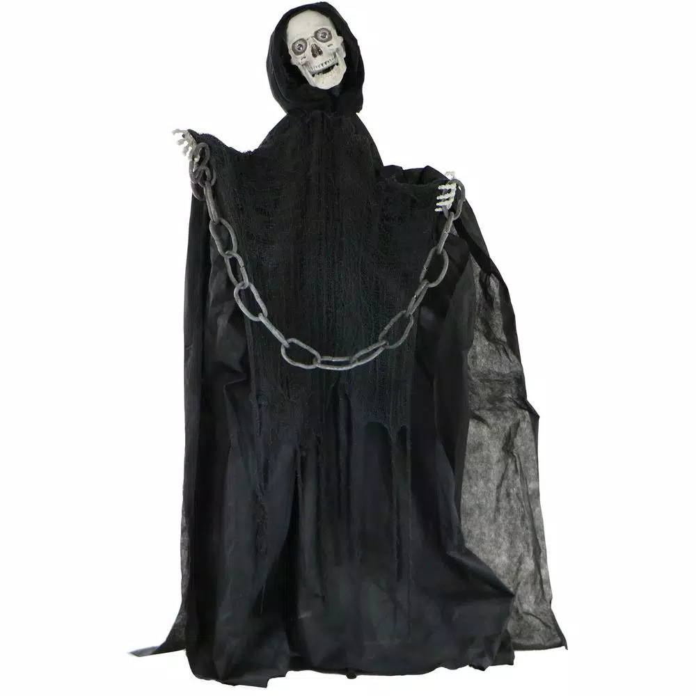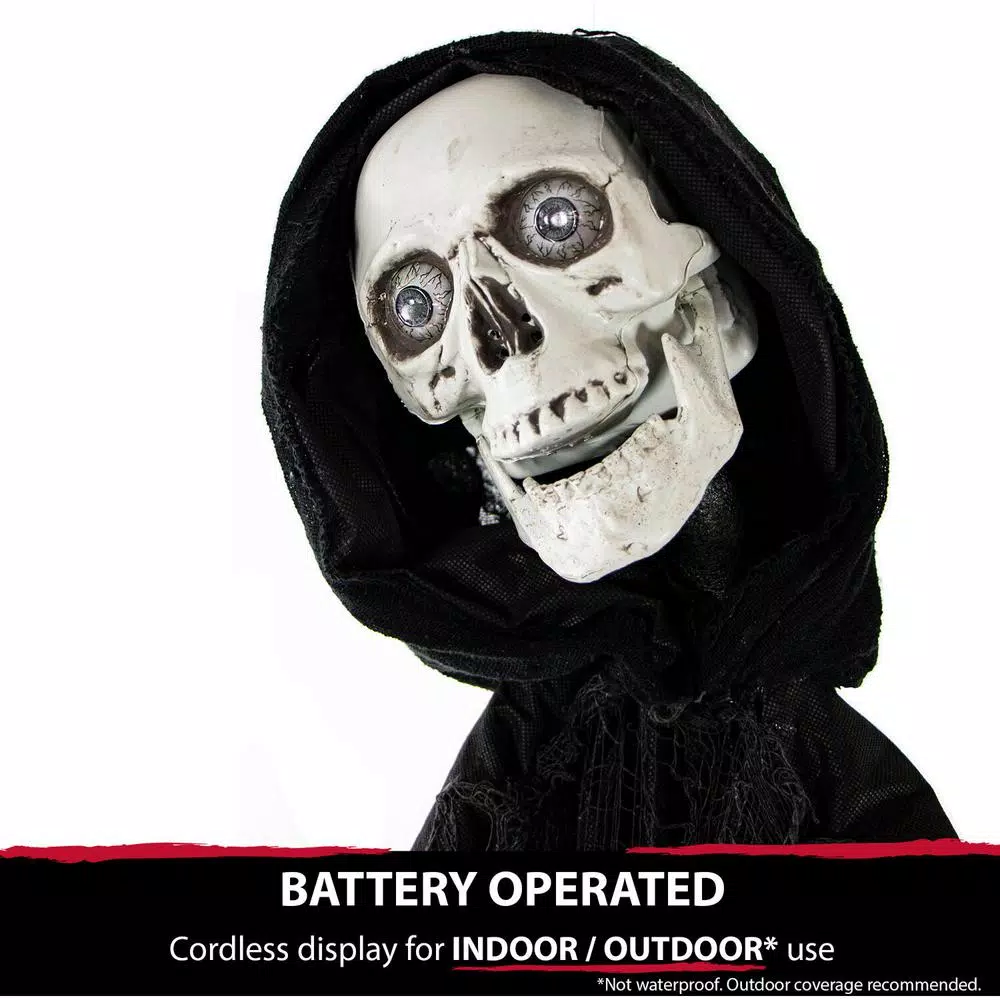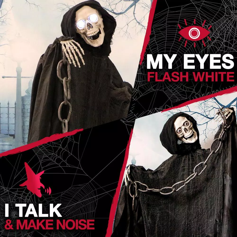 - MULTI-FUNCTIONAL: Creepy and spooky! This talking animated reaper lights up and moans. He will turn your home into a haunted house in no time. Prop on the stand or hang for a spooky graveyard look.