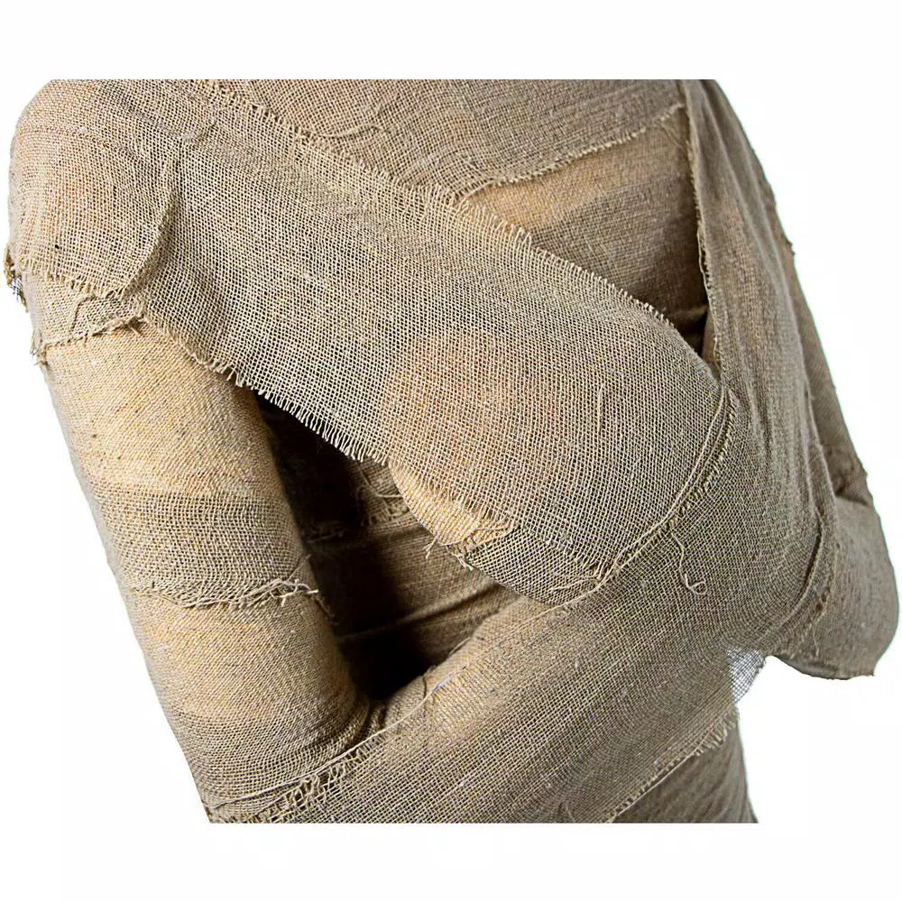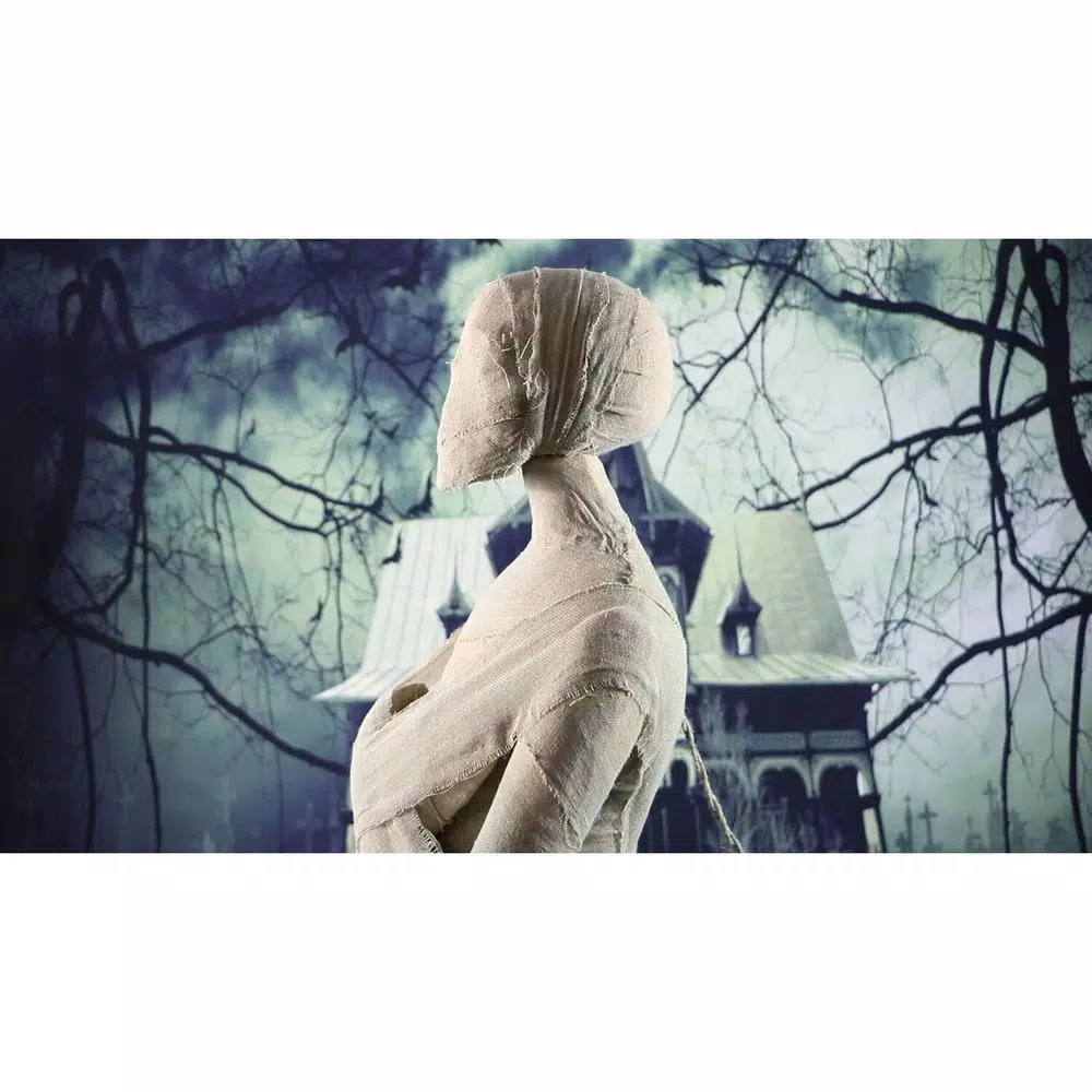 Beware of the mummy’s curse with our life-size standing mummy from Haunted Hill Farm! Standing over 5 feet tall, this wrapped mummy will be the bone-chilling complement to your haunted graveyard or entryway. The attached base provides stability for displaying indoors or a covered outdoor area. Buy two to flank a door or stairway! Wrapped in khaki-colored gauze, this lightweight mummy arrives in two halves – a top and bottom half – that attach quickly and easily. Simply arrange the gauze to conceal the connecting seam, and it is all ready to scare and impress your guests. For all your thrills and chills this Halloween season, count on quality decorations and props from Haunted Hill Farm.