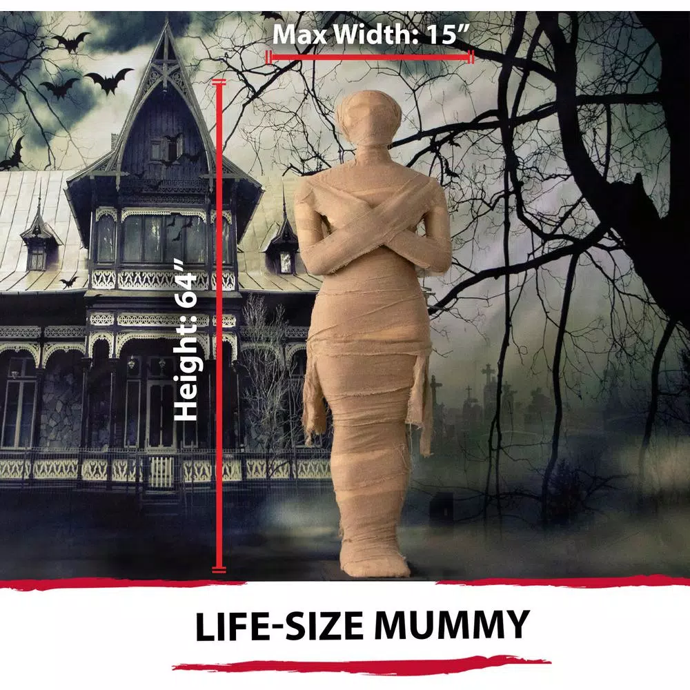 - BEWARE of the mummy’s curse with our life-size standing mummy from Haunted Hill Farm! Standing over 5 feet tall, this wrapped mummy will be the bone-chilling complement to your haunted graveyard or entryway. The attached base provides stability for displaying indoors or a covered outdoor area. Buy two to flank a door or stairway!