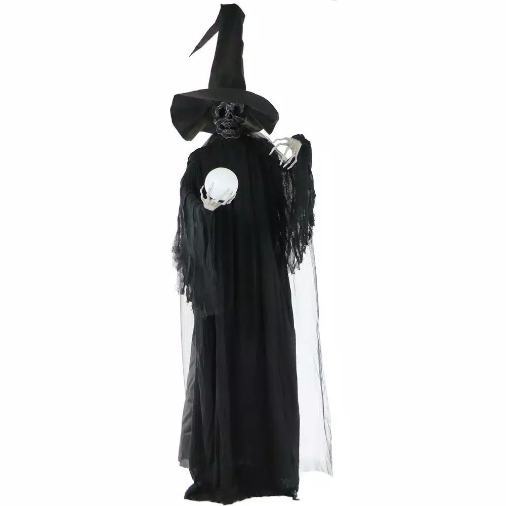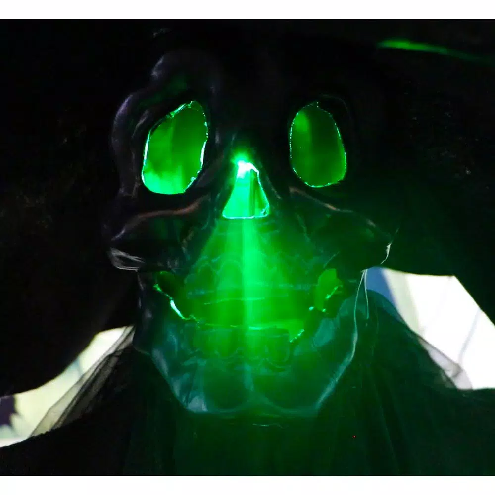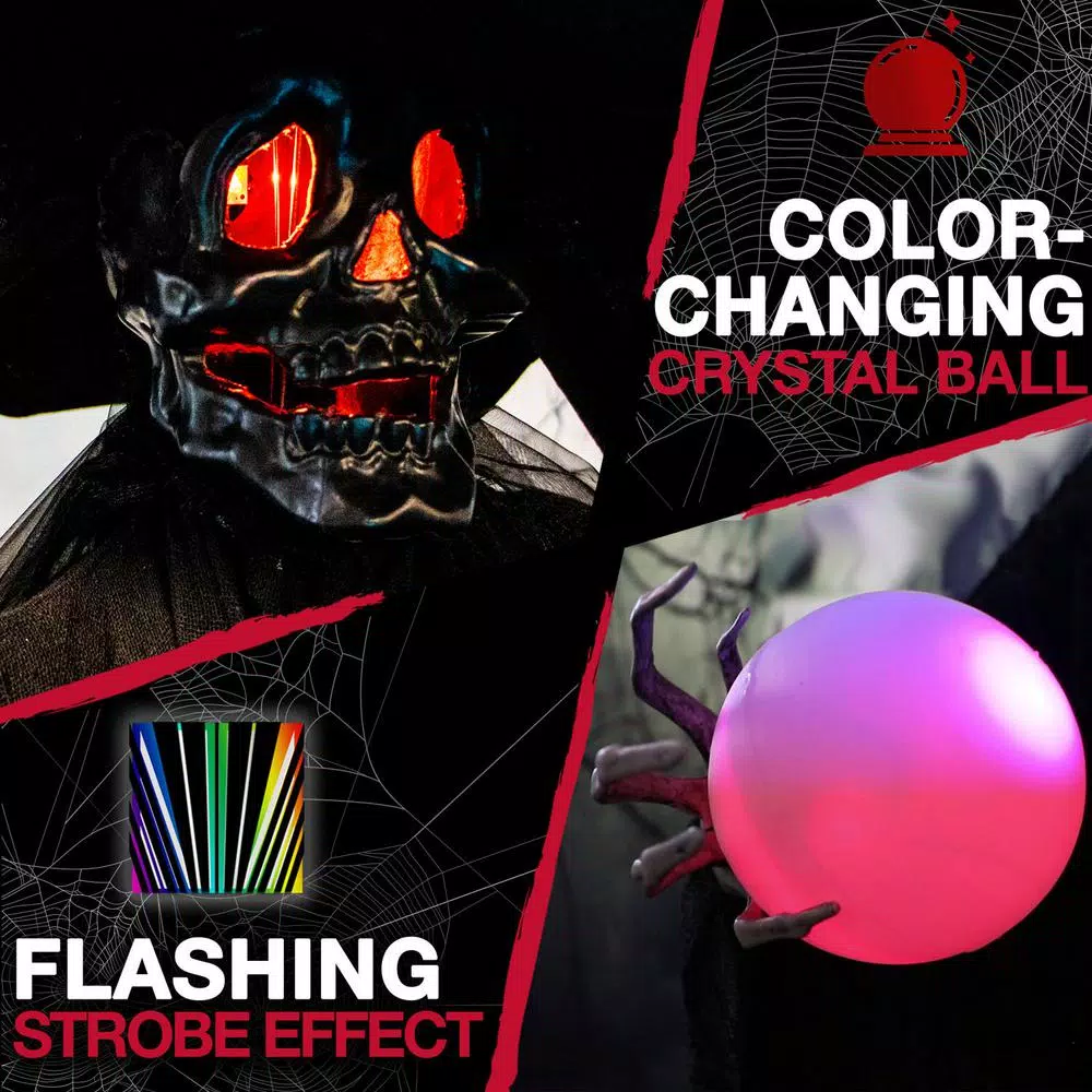 - ANIMATED PHANTOM WITCH: Multi-color crystal ball lights up with strobe effect (can be operated with or without skull lights). Skull lights up with a multi-color strobe light (can be operated with or without crystal ball lights).