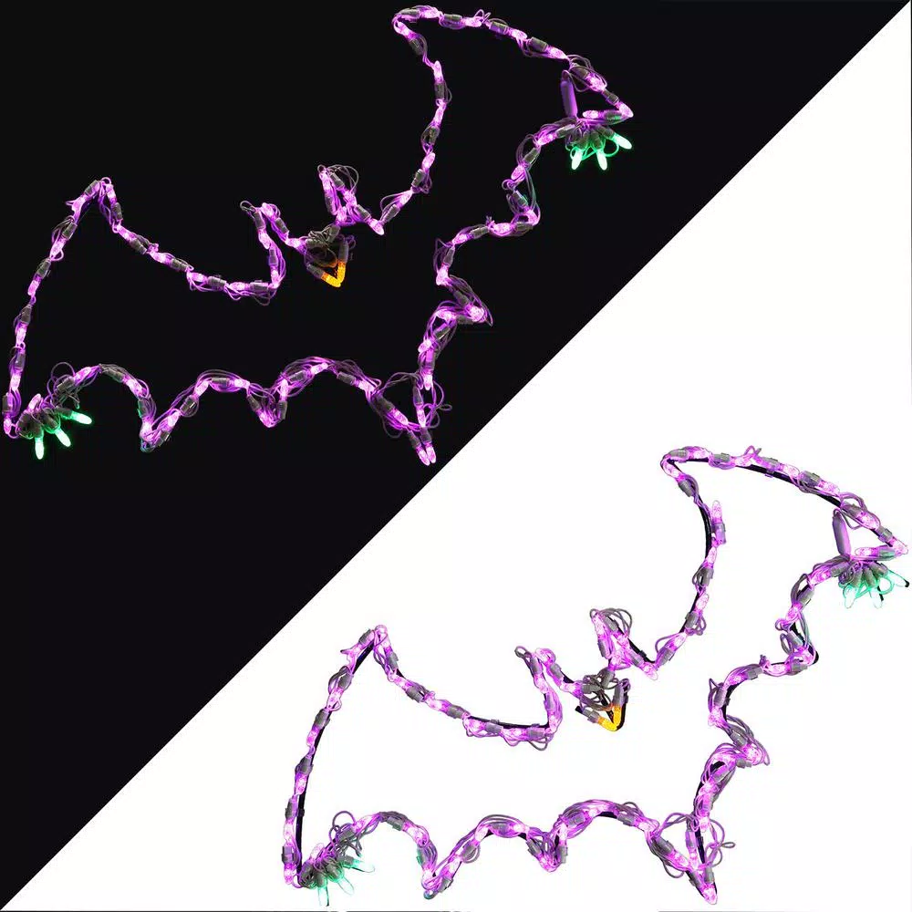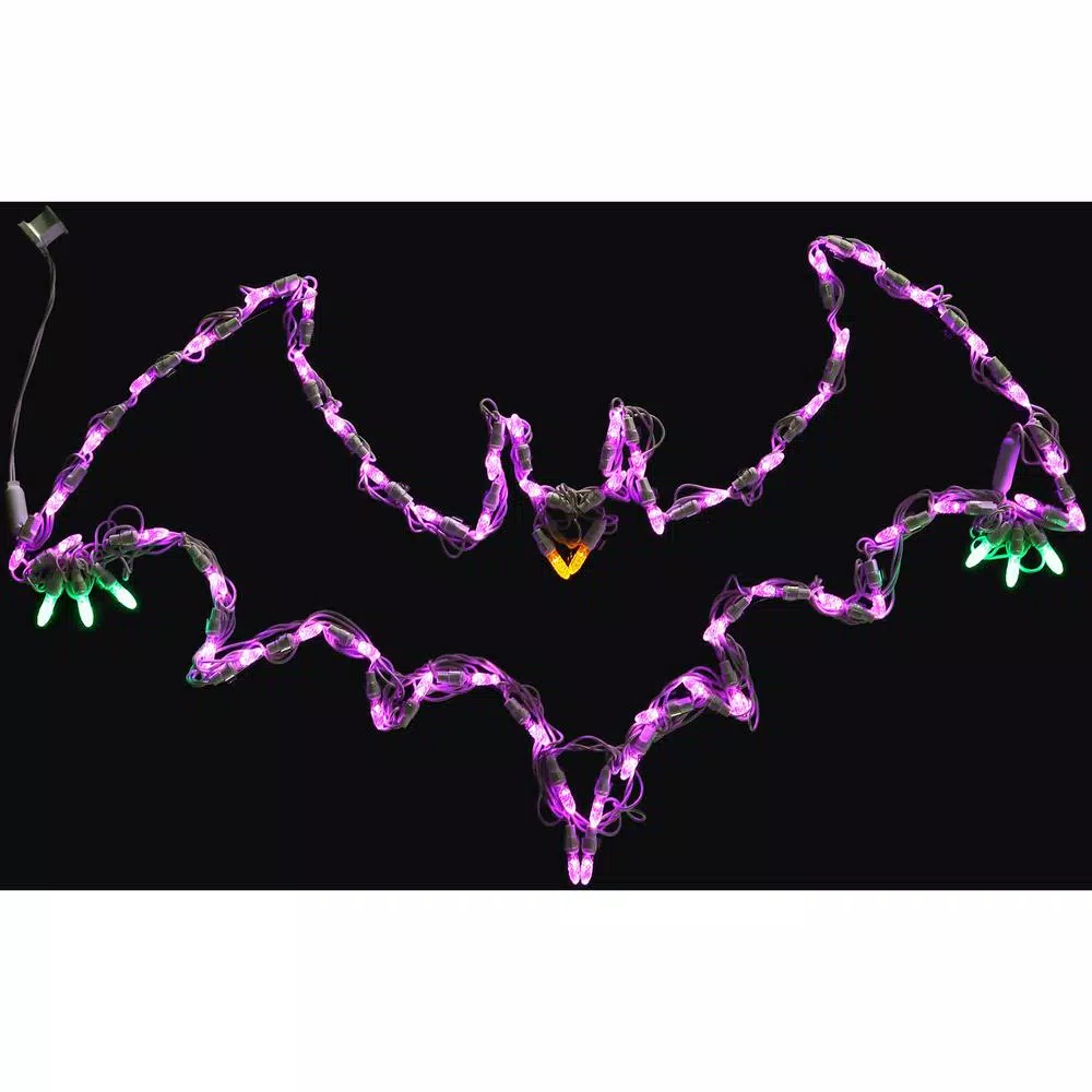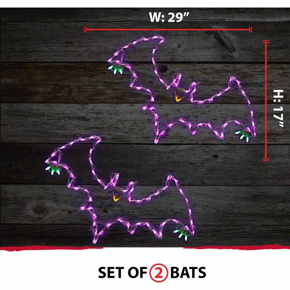 Light up the night with this pair of Flying Bat lights from Haunted Hill Farm. Our collection of spellbinding Halloween lights will help you create lots of spooky fun indoors and outdoors. Stake them on the lawn, mount them to the house or hang them in the windows (stakes and other mounting hardware are NOT included). These weather-resistant shapes feature bright, faceted LED lights mounted on powder-coated metal frames to provide many years of happy haunting. Our set of 2 flying bats (29 in. x 17 in. each) is ideal for hanging on the house, on a wall or in a large window display. For all your thrills and chills this Halloween season, count on quality products from Haunted Hill Farm.
