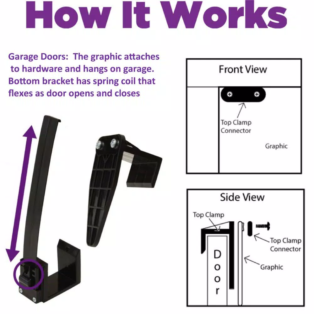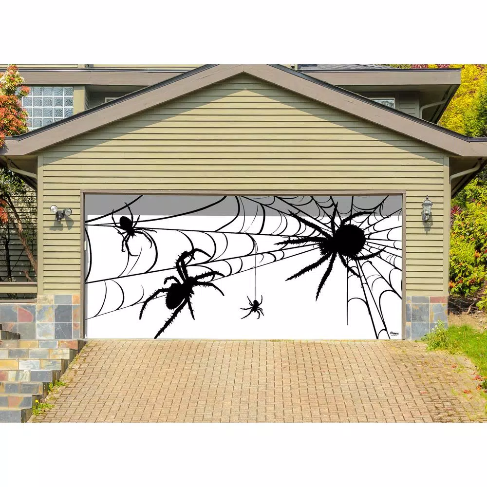 Halloween Garage Door Banner Mural Sign decor 7 ft. x 16 ft. Car Garage β The Original Holiday Garage Door Banner Decor by My Door Decor, makers of My Door Decor. Proprietary components for easy assembly, allowing door to open and close without hurting the integrity of the door. Huge selection of holiday themes at My Door Decor. Garage Door Decor is manufactured to fit roll-up (sectional) paneled garage doors, as well as canopy (flat) garage doors. Weβve developed a system that makes installation quick and easy. This system requires no tape or screws, which could potentially damage your garage door. Instead, our hardware consists of a hook attachment that goes over the top of the garage door and a tension hook at the bottom. The top hook attachment protects your mural from theft by keeping it securely held behind the frame of the garage door. The tension hook keeps the mural taut when the garage door is closed and protects it from wind damage by flexing with the mural. Each garage door banner is ready to hang with minimal assembly. 2-people installing a single mural should take about 10-minutes. Every banner, whether itβs for your front door or garage door, comes with assembly hardware so it can be installed right out of the box.