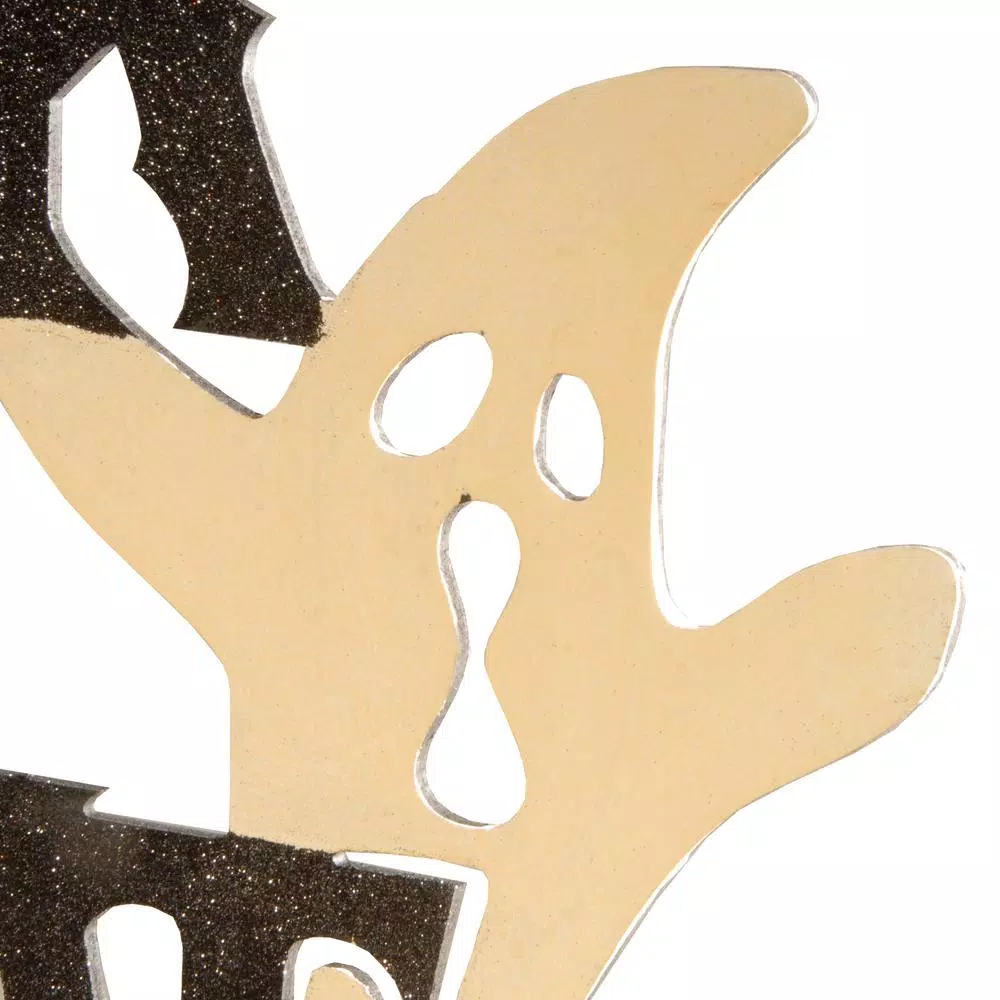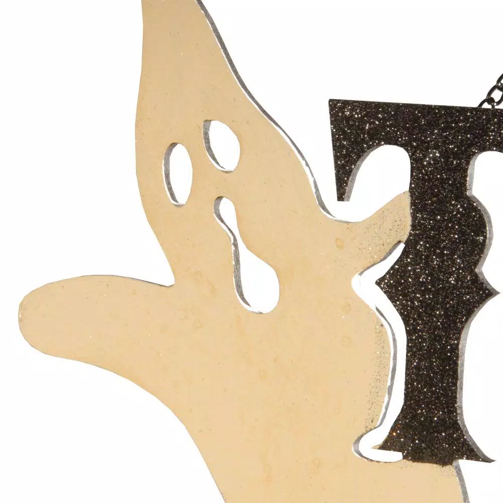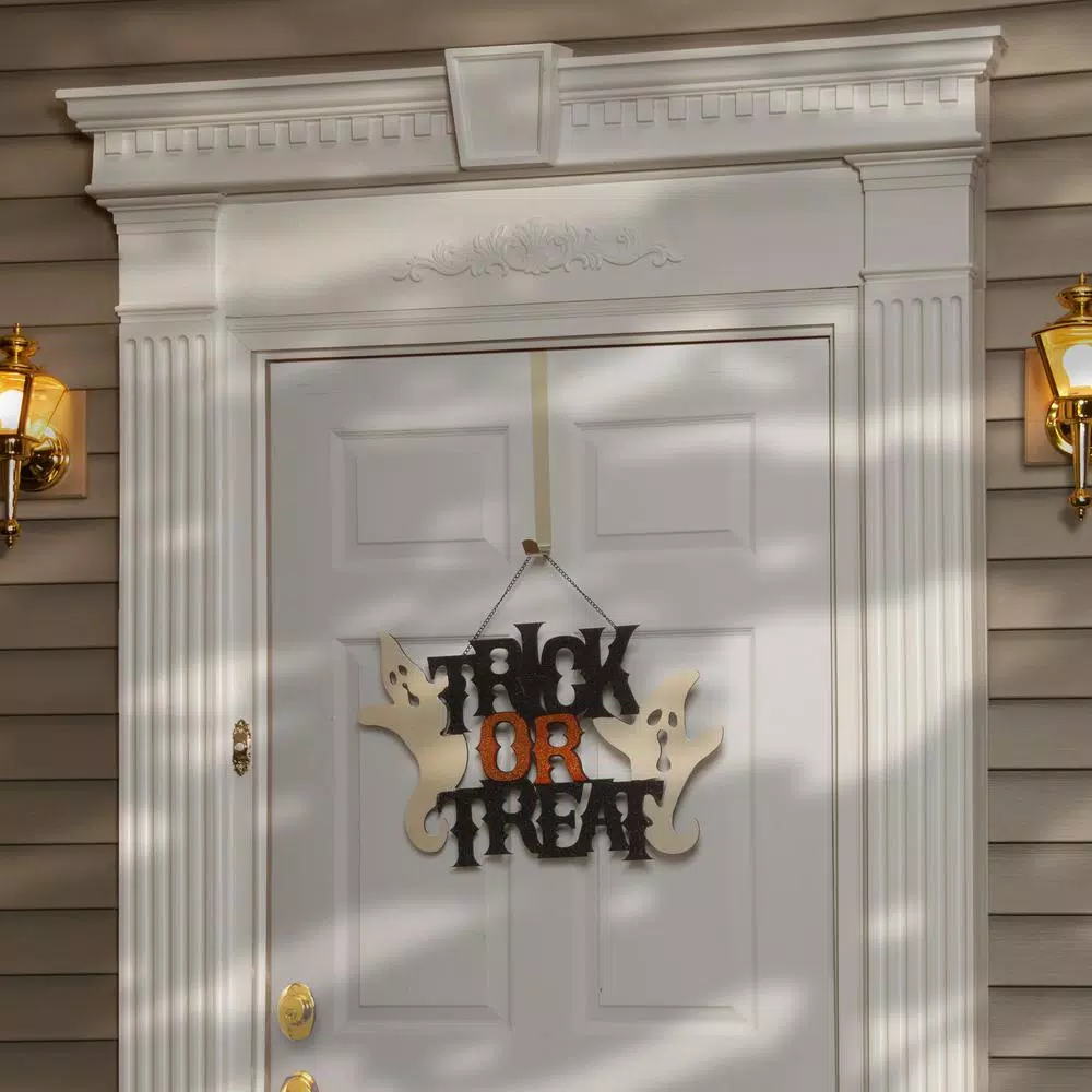 This Halloween decoration is constructed of ornately cut lightweight fiberboard featuring Trick or Treat in sparkled black and orange colors. On either side are flowing apparitions adding a spooky and fun finishing effect. Includes braided metal chain. Hang this seasonal sign on doors or walls in indoor or covered outdoor locations.