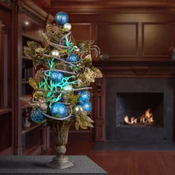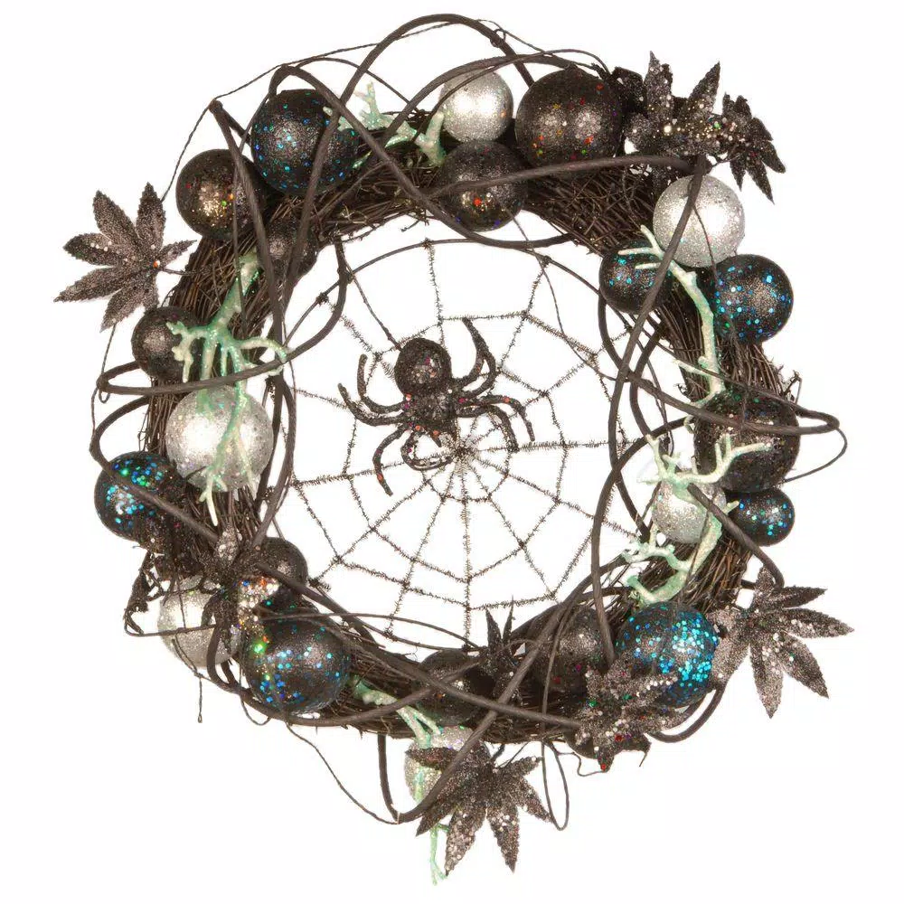 This Halloween trimming features a creepy collection or curling black vines, silver and black ball ornaments and darkened leaves all on a woven branch base. In the center is a swirling web with its creator, a large ominous spider waiting patiently. Hang this ghoulish wreath on doors, walls and windows in indoor or covered outdoor locations.