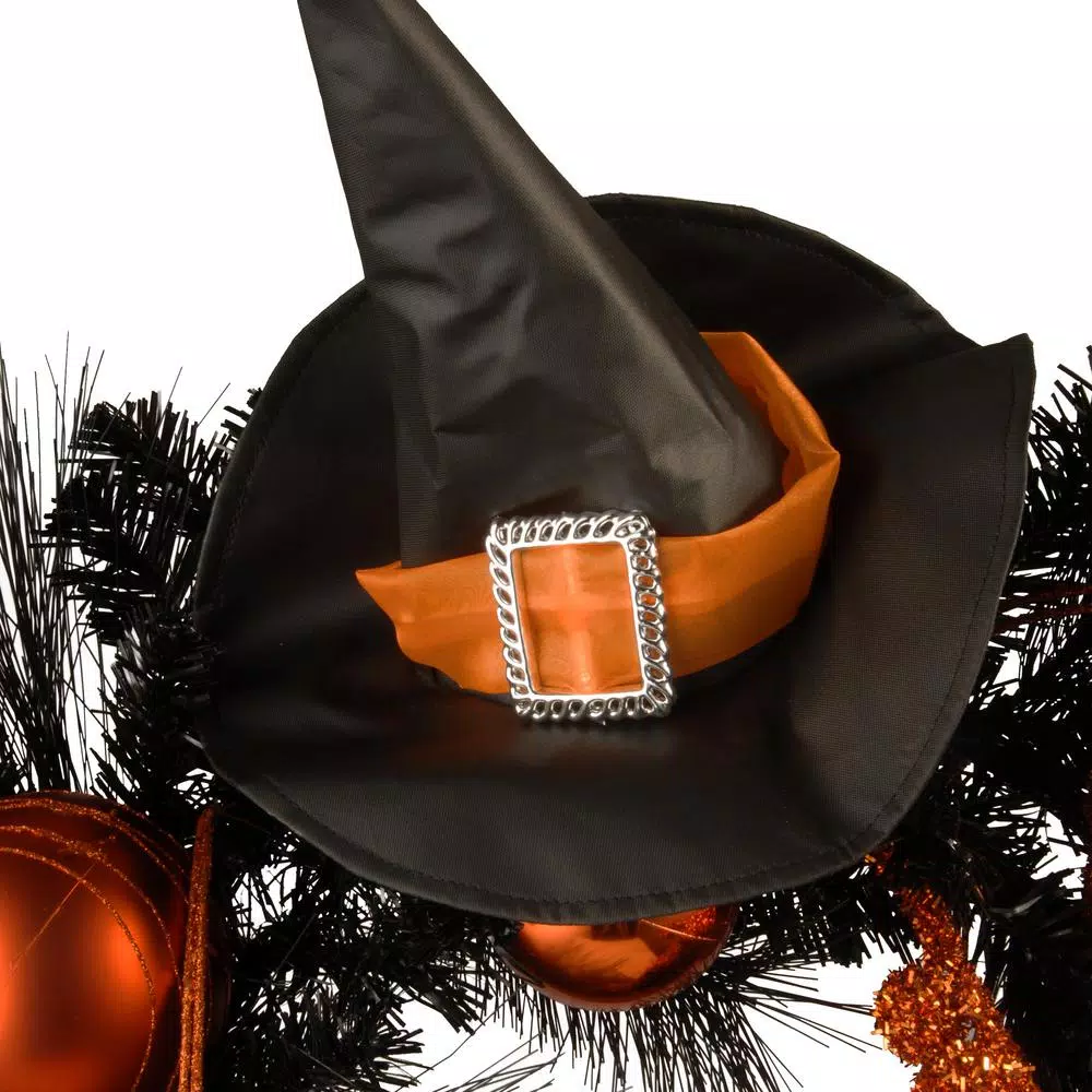 This black Halloween wreath is topped with an orange-banded witchβs hat while 2 orange and black striped legs with pointed shoes hang from below. An orange glittered broom lies across the front that is trimmed with an assortment of glittered pumpkins and orange ball ornaments. Hang this creepy decoration on doors, walls and windows in indoor or covered outdoor locations.