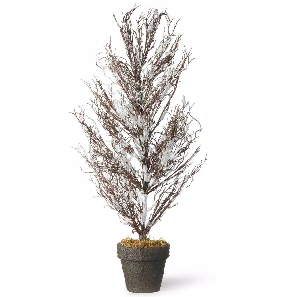 This seasonal decoration features a winter tree sprouting up through grassy moss from a green growerβs pot base with modeled finish that is weighed for stable display. The tree branches and stems are spotted with white flocking to give the appearance of freshly fallen snow. Display on tabletop or floor in indoor or covered outdoor locations.
