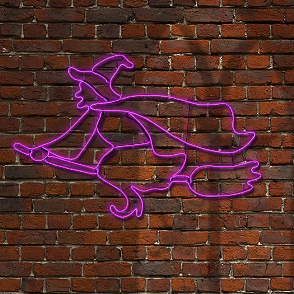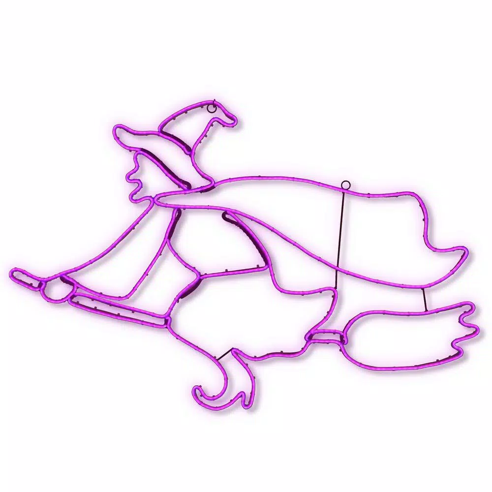 Similar to neon, this decoration is constructed of rigid tubing that glows with an eerie purple light. Featuring the outline of a witch flying on her broom, this wall decoration is lit from within with tiny LED lights that are energy efficient and long-lasting. Mounting loops are built-in for no-fuss hanging. For indoor or outdoor display.