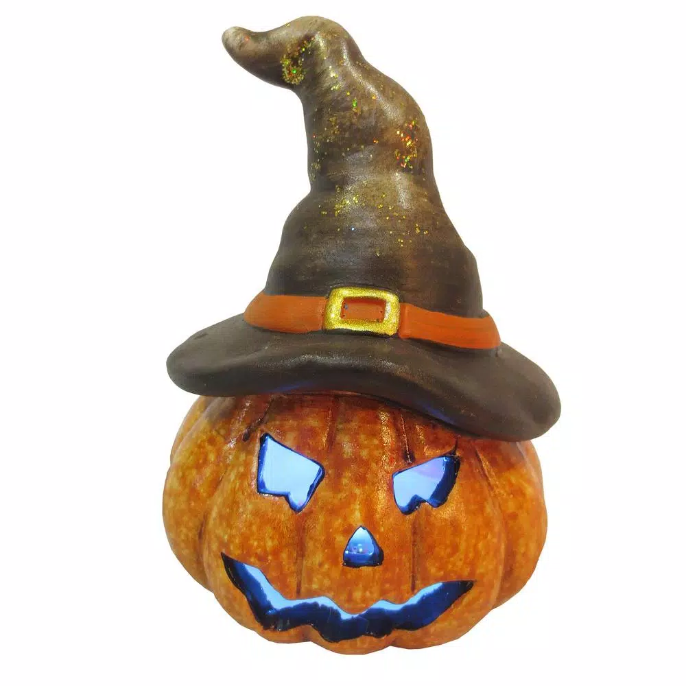 This Halloween decoration features a bright orange scary carved pumpkin wearing a black witchβs hat. Color-changing battery operated LED lights (repeating red/blue/green) shine from inside the piece through the cutouts. It is constructed of strong poly resin material for long-lasting enjoyment.