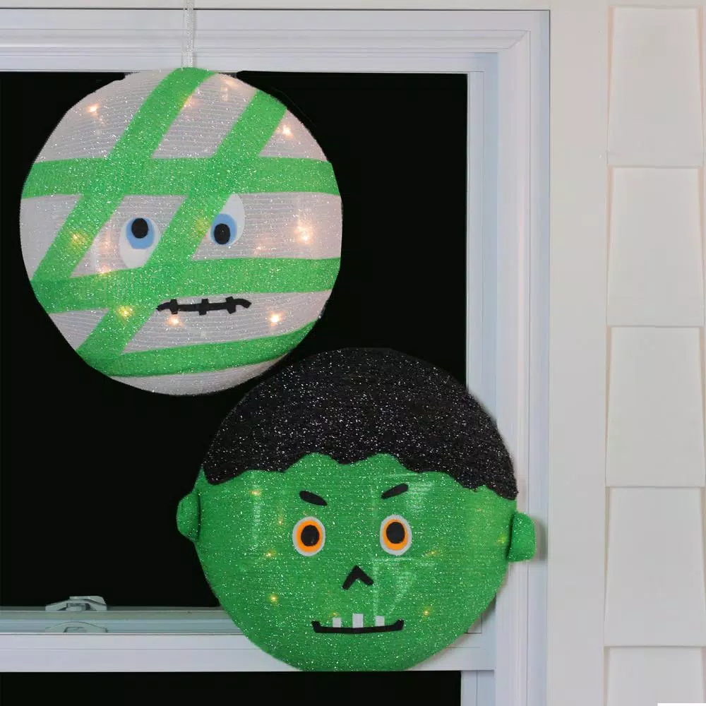 These unique hanging decorations are a perfect addition to your Halloween decor. They are pre-lit with 15 warm clear LED lights. βWarm clearβ also known as βwarm whiteβ has a nice natural warm incandescent like glow. Featuring a mummy and Frankenstein, each comes ready-to-hang on a satin ribbon.