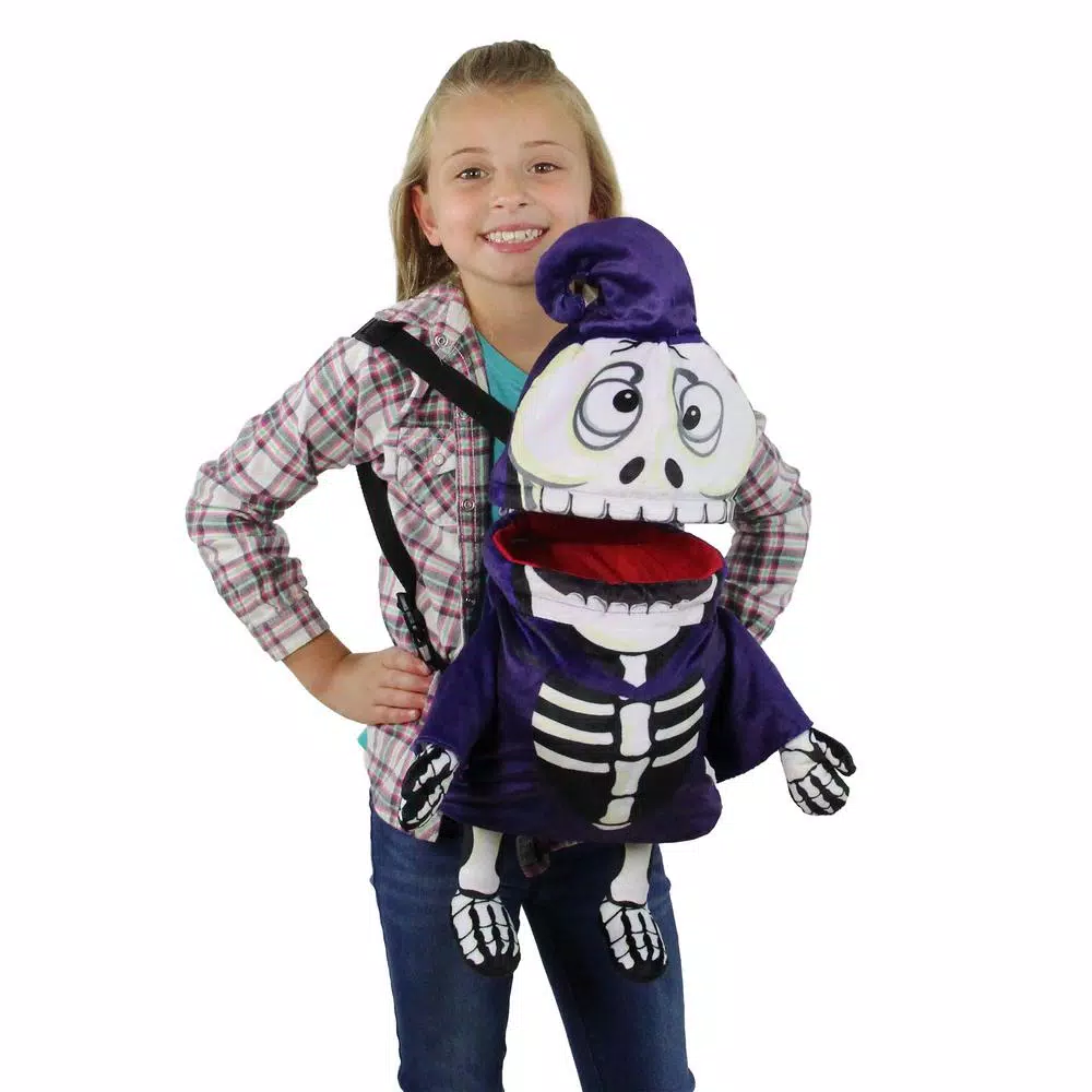 Trick-or-treat in style this year with our ultra-cool animated Halloween candy bag The unique design allows the skeleton’s mouth to open and close so that your loot can be gathered and safely stored while trick-or-treating. Press the left hand and the bag will come to life singing to the tune of the hit song I Want Candy. The bag can also be worn as a backpack and is the perfect Halloween accessory to complete your child’s skeleton costume Product Features: Super plush Halloween bag with flat bottom. Adjustable shoulder straps with side release buckles. Generously sized to fit lots of candy. Designed to be worn on the front but can also be worn as a backpack. Press the right hand to open and close the skeleton’s mouth. Press the left hand and it will send you a greeting and play a Halloween version of the song I Want Candy. On/off switch located on the back. Requires (3) AAA in. size batteries – included. Dimensions: 24 in. H x 14 in. W x 8 in. D. Material(s): polyester/plastic/nylon/metal.