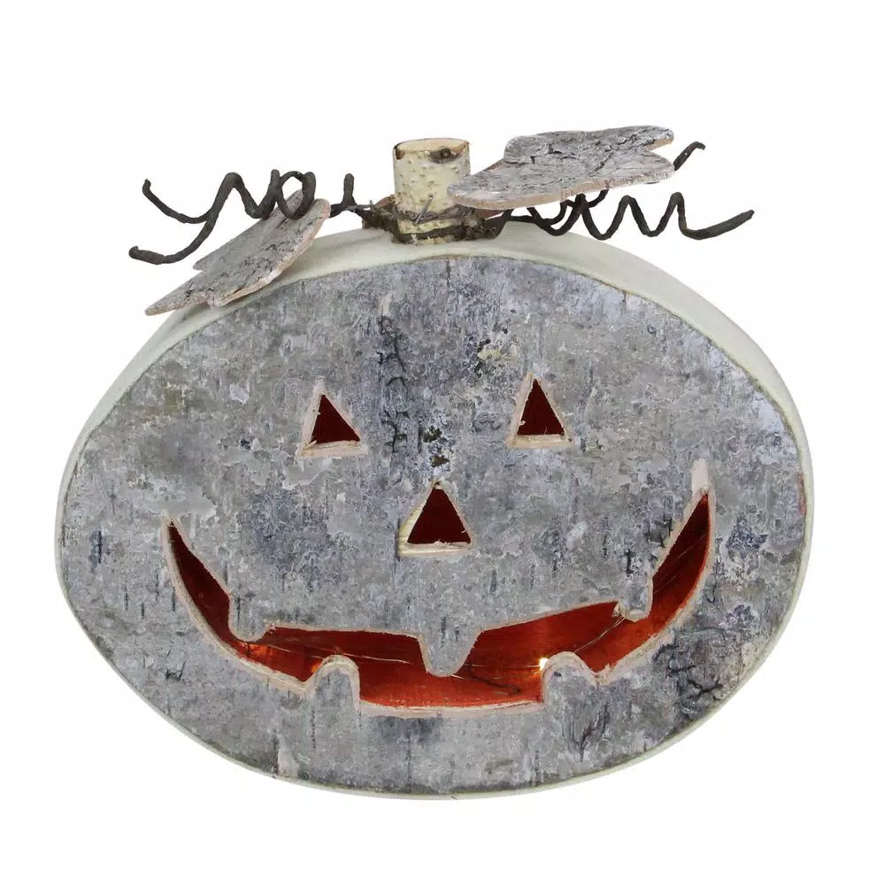 This medium Jack-O-Lantern will be the perfect addition to your Halloween decor. Itβs weathered face will fit into any scary scene. Use it to light the way in your haunted house or add to tabletops or mantles for a soft glow. Product Features: Pre-lit with 10 warm clear LED light. Warm clear also known as warm white has a soft natural incandescent glow similar to candlelight. Bulb size: micro-bulbs. Front has a weathered wood design. Back is made of orange wood. Micro bulbs illuminate off the orange background. Jack-O-Lantern has a smiling face cutout. Topped with a weathered leaf design. Cream felt fabric sides. 1 sided design. Additional Product Features: LED lights use 90% less energy. Super bright bulbs. Steady burning bulbs. Requires 2 AA size batteries β not included. Convenient on/off switch on battery pack. For indoor use β if using outdoors place under a covered area. Non-replaceable bulbs. Cannot be connected with other lighted items. Dimensions: 8.5 in. H x 9.25 in. W x 2.25 in. D. Material(s): wood/felt/plastic/wire/metal.