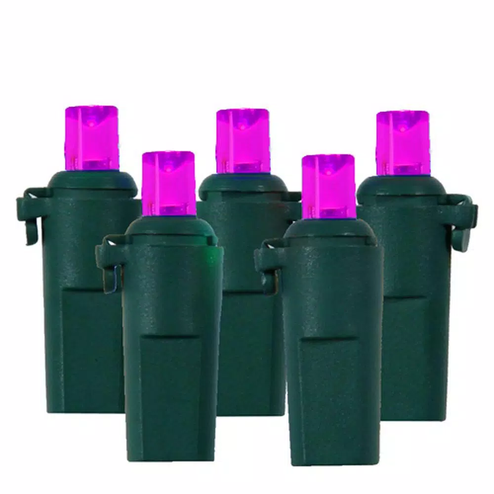Set of 60 LED Wide Angle Christmas Lights. Item #G6244611. Features: Color: pinkish-purple / green wire. The manufacturer of these lights call them pink but the actual color when lit is a bright pinkish-purple color. Number of bulbs on string: 60. Bulb size: concave wide angle. Spacing between each bulb: 4 in.. Lighted length: 19.6 ft. Total length: 21 ft. Additional product features: LED lights use 90% less energy. Lights are equipped with Lamp Lock feature which makes them replaceable interchangeable and keeps them from falling out. Strand contains 2 rectifiers this eliminates the shimmer and shake in the light set. Super bright bulbs. If 1 bulb burns out the rest will stay lit. Durable non-glass replaceable bulbs. Cool to the touch. End-to-end connectors allow you to connect multiple sets together (not to exceed 210-Watt). Wire gauge: 22 . Comes with replacement bulbs and fuse. UL listed for indoor/outdoor use. 120 volts 60 Hz 0.05 Amp 6-Watt.