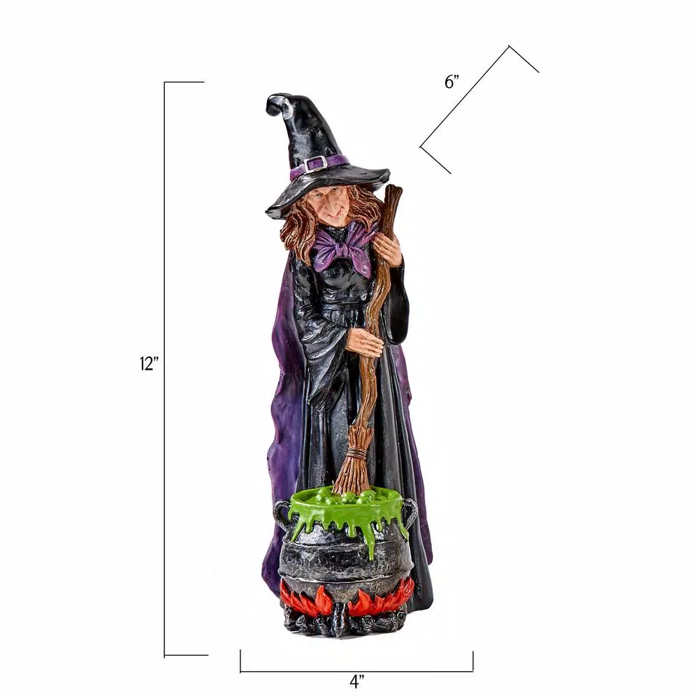 Rich in detail this witch stirring the pot can be placed on table mantle or curio cabinet. The witch is stirring an overflowing pot with a broom, wearing a hat and cape. Use all year round.