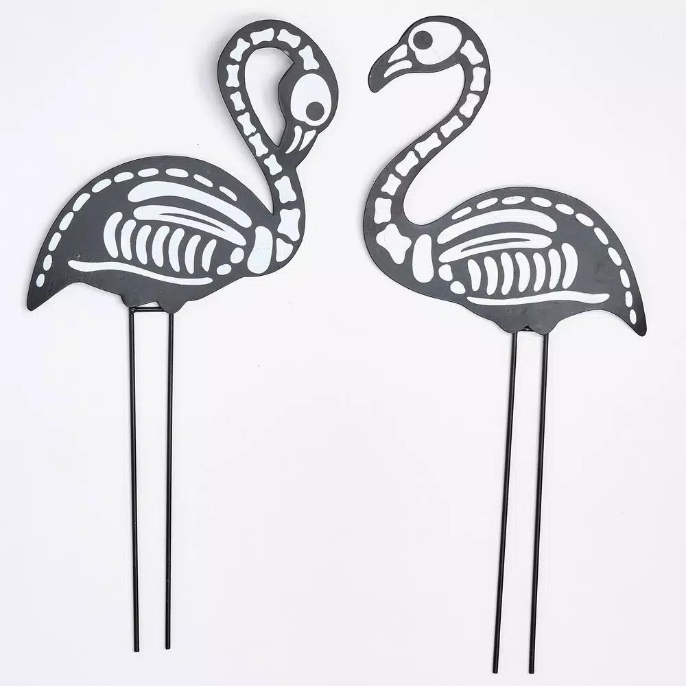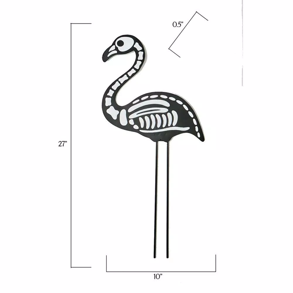 Give your outdoor Halloween decor a different look with our fun metal skeleton flamingo. This flamingo stake has its skeleton drawn making it look spooky yet fun. Definitely the perfect accent to any Halloween decor.