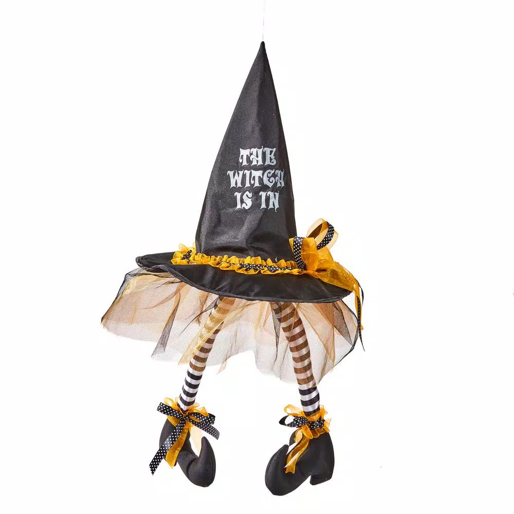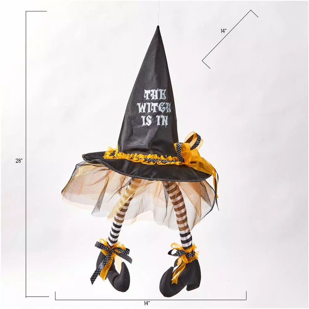 This adorable hanging witch hat is the perfect accent to your home. It features a witchβs hat and legs with a whimsical message. It is made of polyester, organza and ribbon.