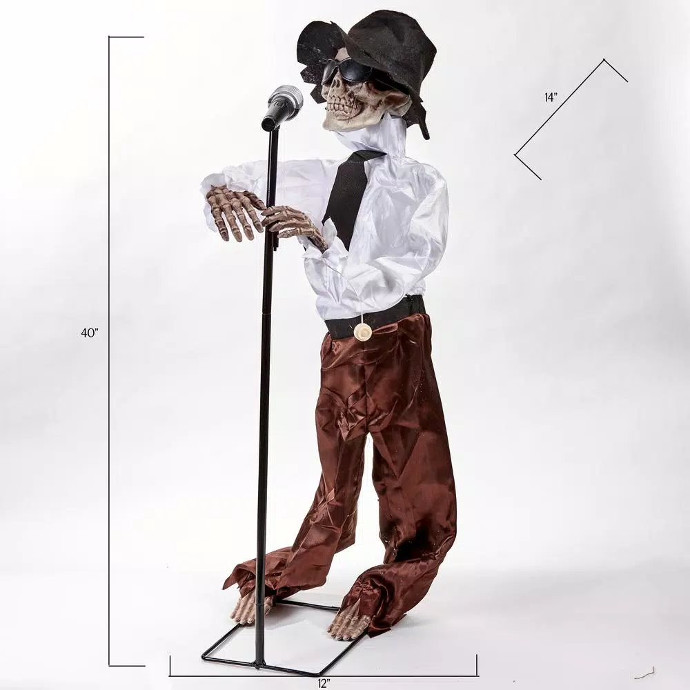 This singing skeleton is the perfect addition to your Halloween decor. The skeleton sings and dances when activated and dressed in a shirt, tie and hat. It is attached to a stand with microphone.