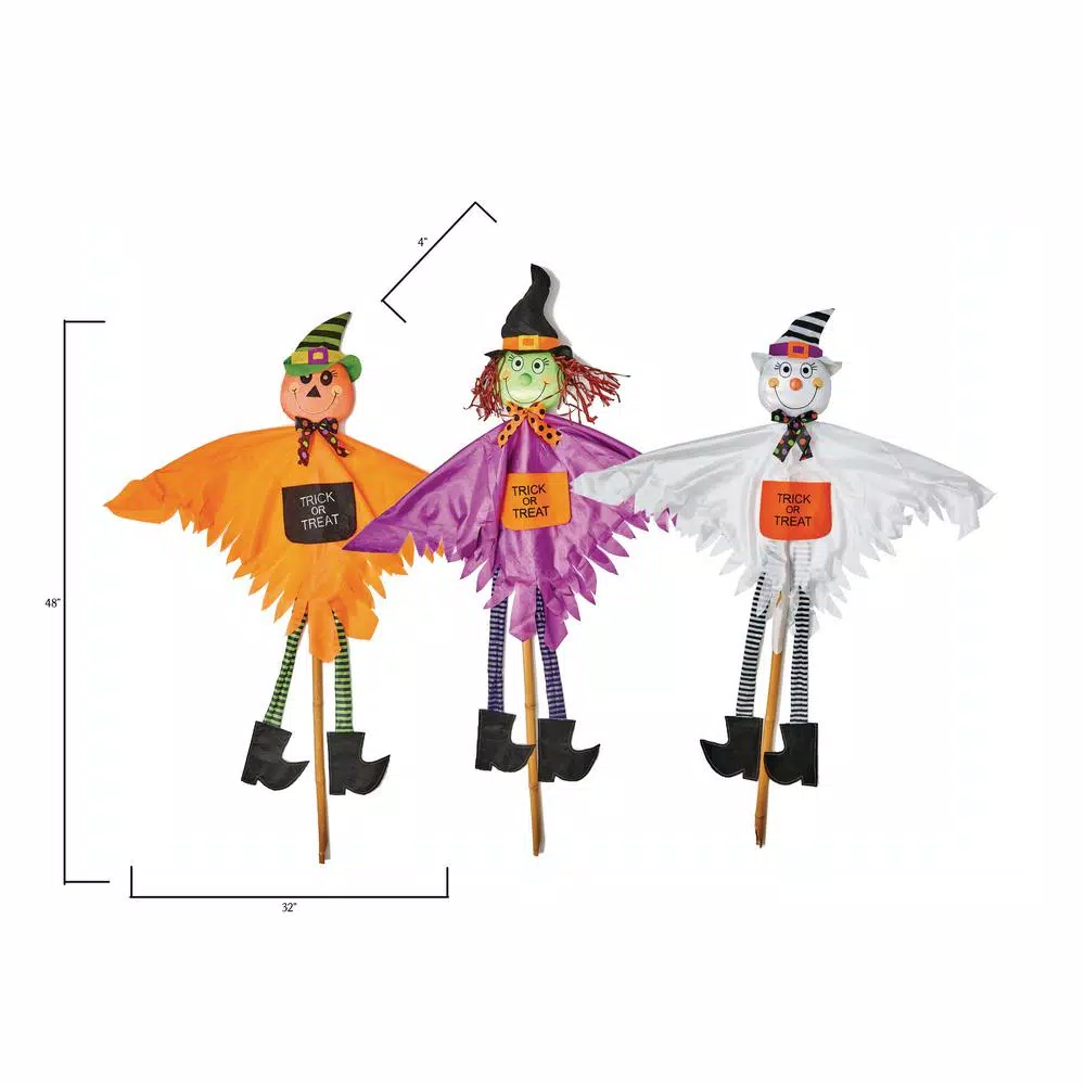 These adorable Halloween stakes are the perfect accent to your fall yard display. The Halloween characters feature poseable wire arms, glittered faces and colorful felt details. They are attached to a sturdy wooden base.