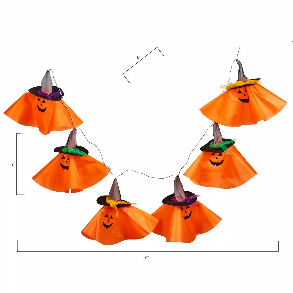 Make your Halloween more festive with our light up pumpkin garland. It features pumpkin faces with lighted witchβs hats. Under the black hats are LED lights that flash red, blue and green. The garland can be displayed on mantels, doorways or staircases.